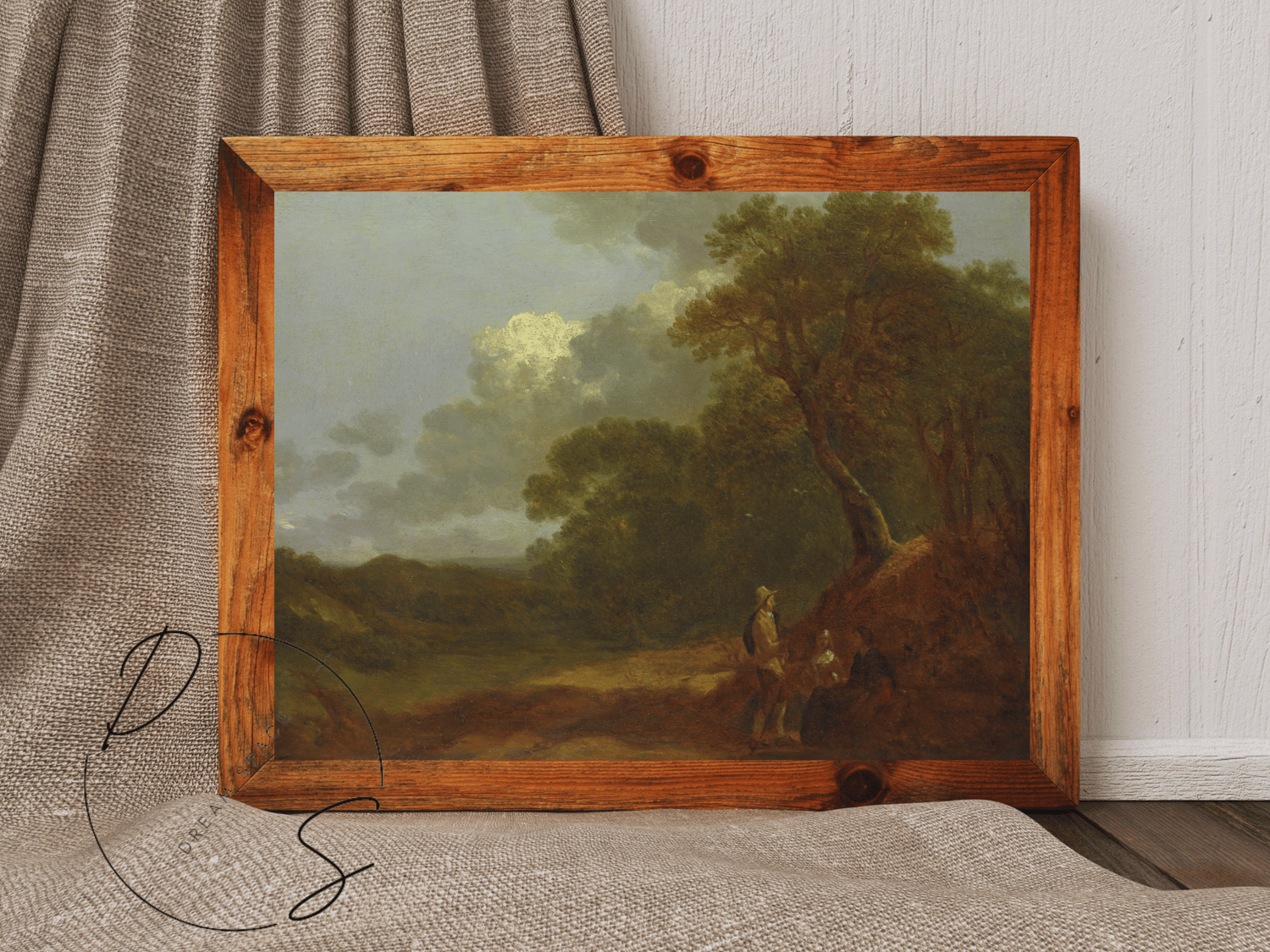This is DIGITAL PRINTABLE PRODUCT | Instantly download and print this Wooded Landscape with a Man Talking to Two Seated Women Painting by Thomas Gainsborough. Original artwork 1760s.