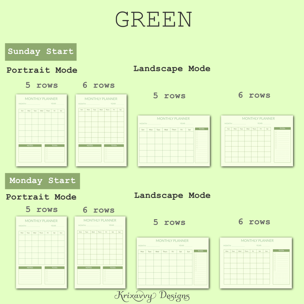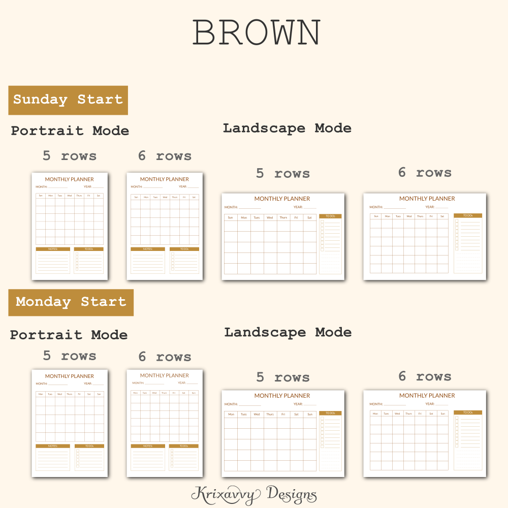 Printable Monthly Calendar | Printable PDF | A4 Size | Undated Monthly Planner | Brown Color | Green Color | Pink Color | Green Color