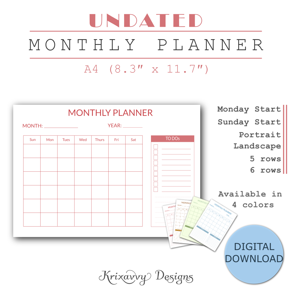 Stay organized and focused all year round with this UNDATED printable monthly calendar planner! Designed for flexibility and simplicity, this undated planner can be used any month, any year—just print and plan! Whether you're mapping out your goals, appointments, work schedule, or family events, this clean and functional layout is perfect for keeping life on track.