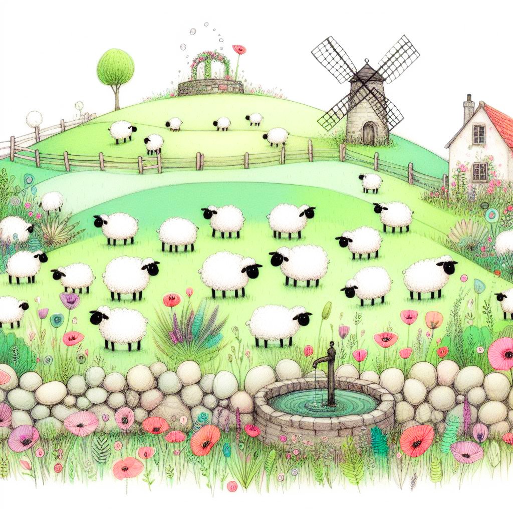 A whimsical world of sheep gathered on high hills with a water fountain & windmill.