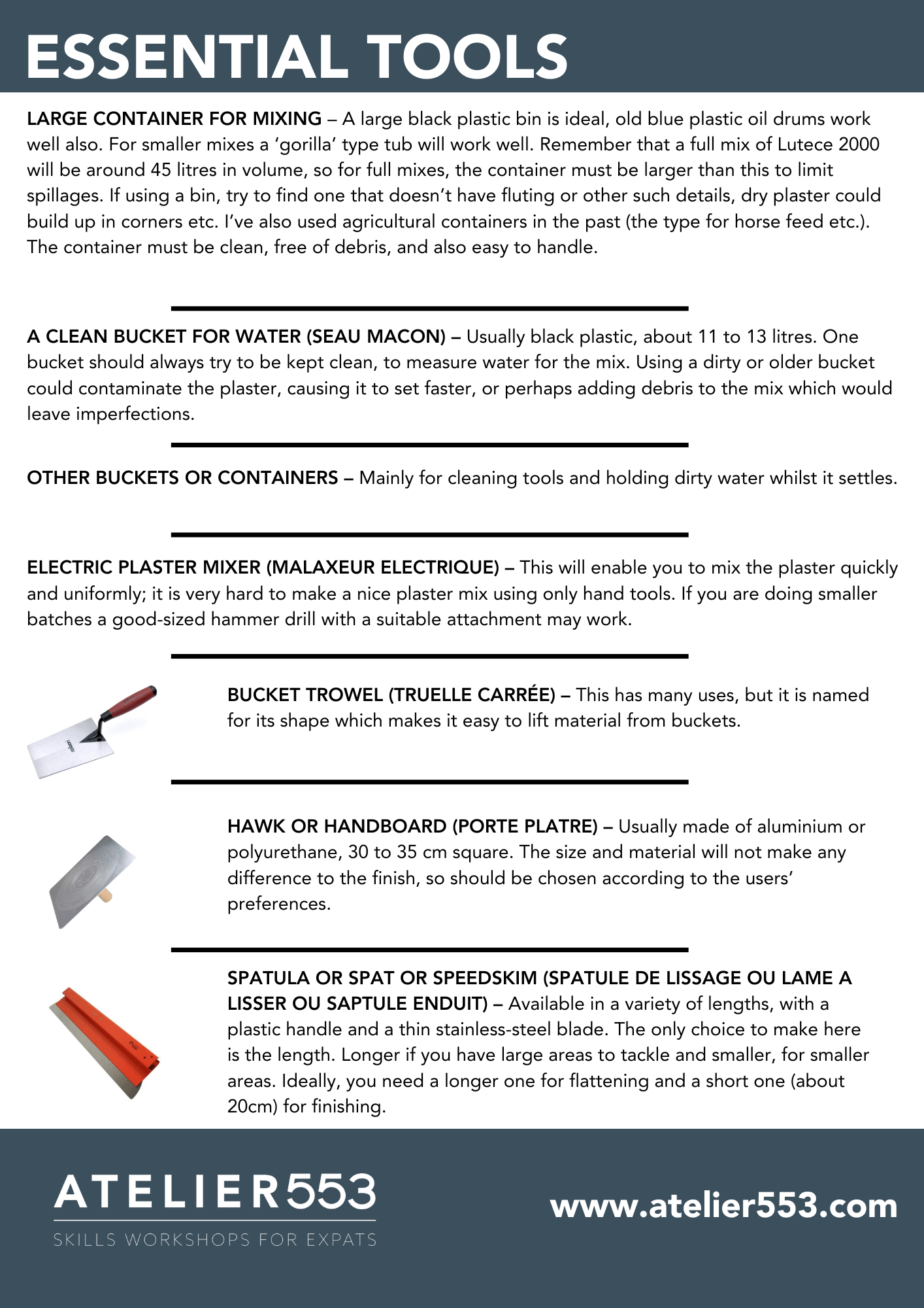 - Tools You’ll Need: A straightforward guide to essential plastering tools that can be purchased in France.