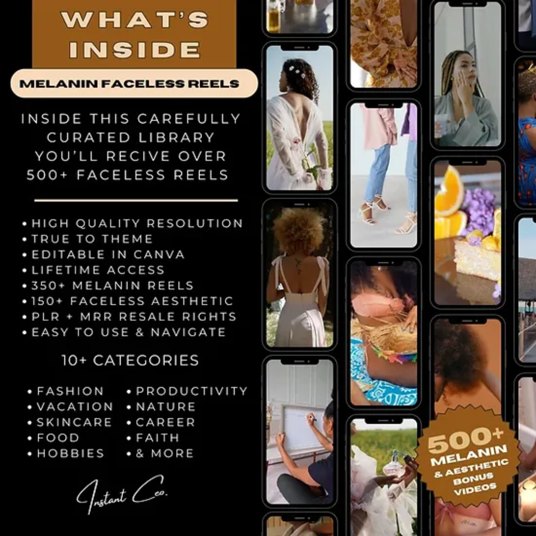 Inside this huge library, you'll receive over 500+ faceless videos featuring predominantly black females, that you can use to create stunning Instagram reels for your social media accounts within minutes! 🔥