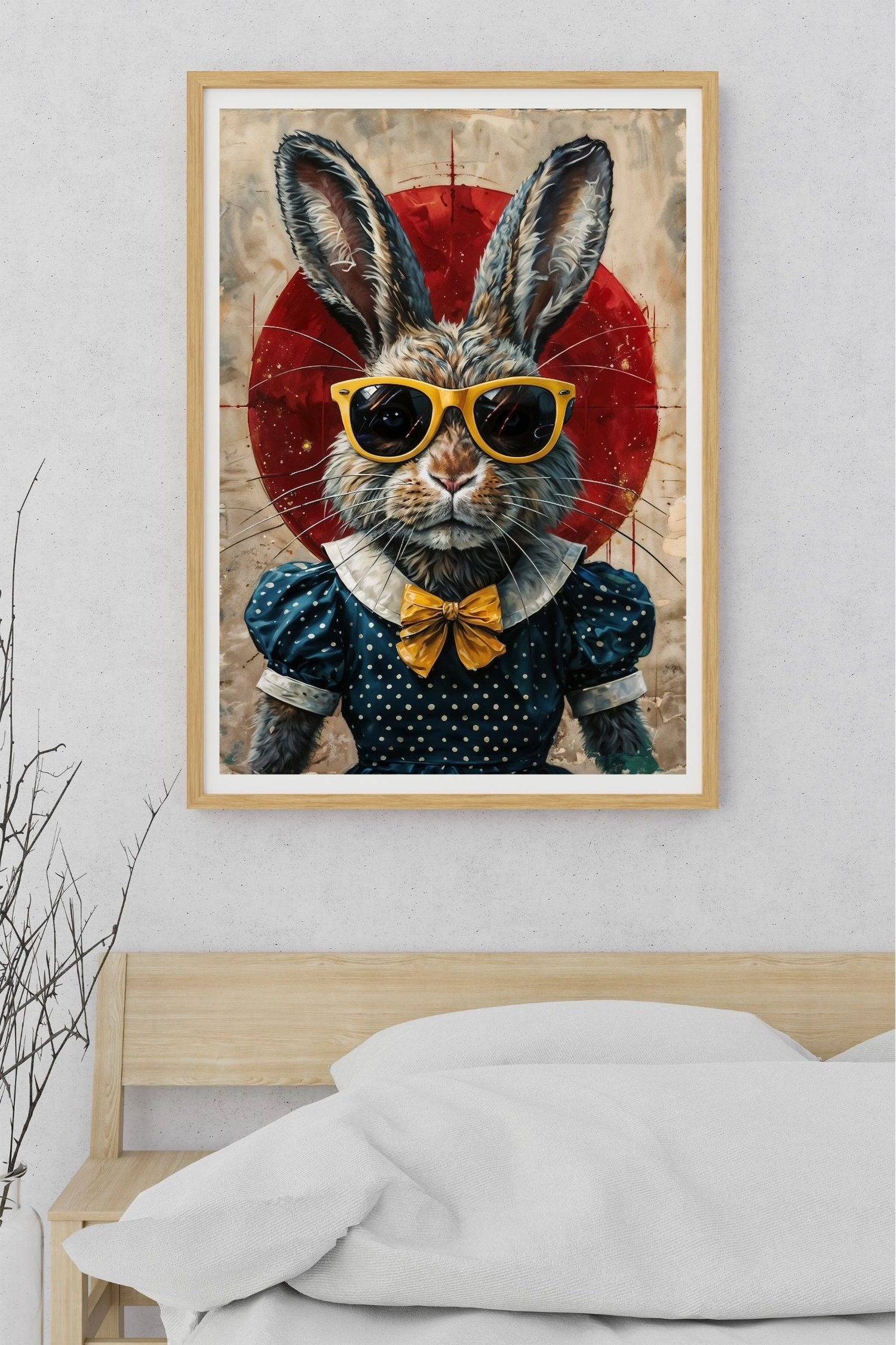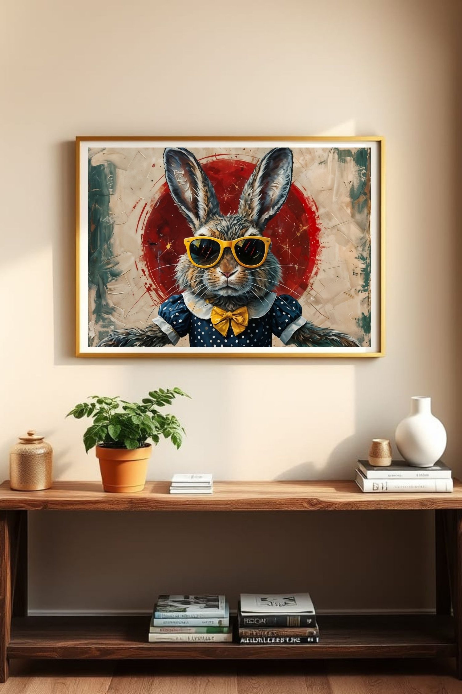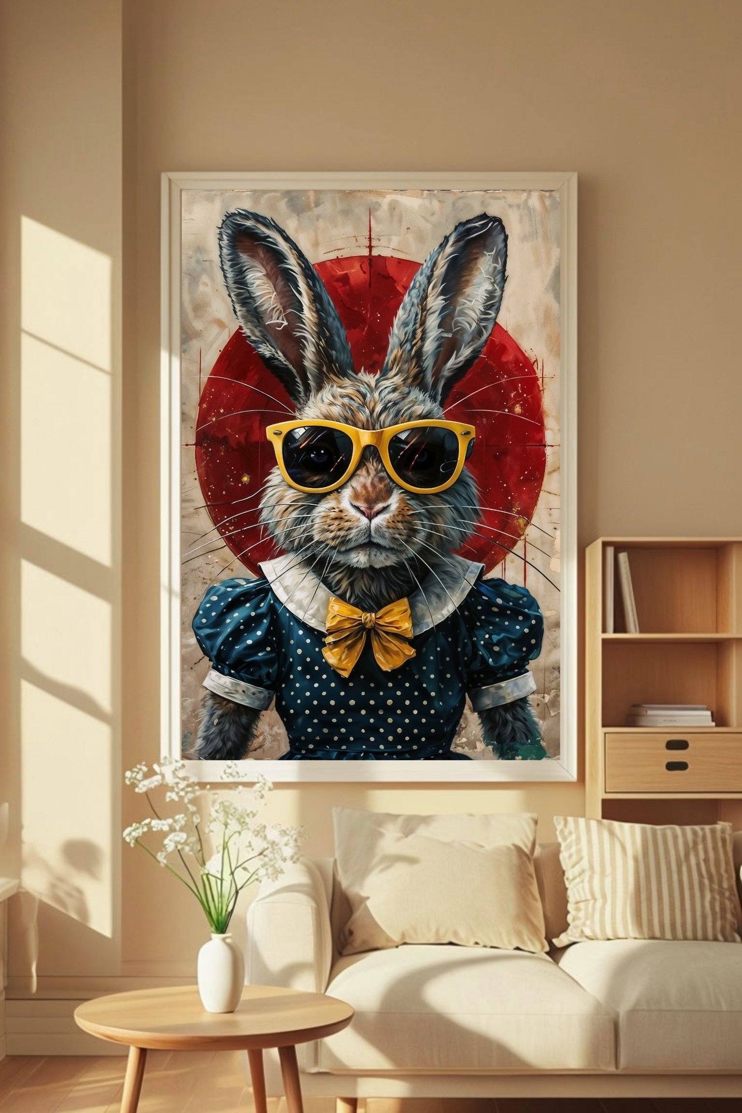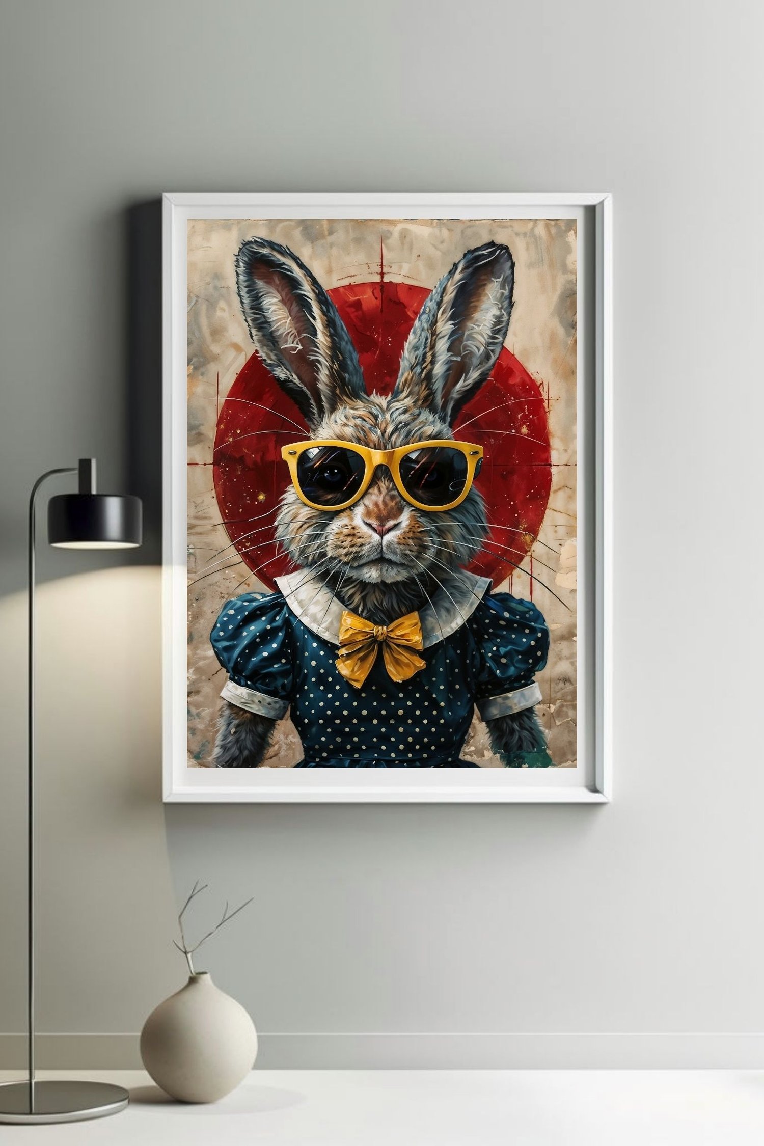 Add instant personality to your walls with this Cool Rabbit Wall Art β featuring a stylish bunny dressed to impress in a vintage polka-dot dress, yellow bow tie, and oversized sunglasses. Set against a striking red circle backdrop, this playful digital artwork brings together retro charm, humor, and bold design in one unforgettable piece.