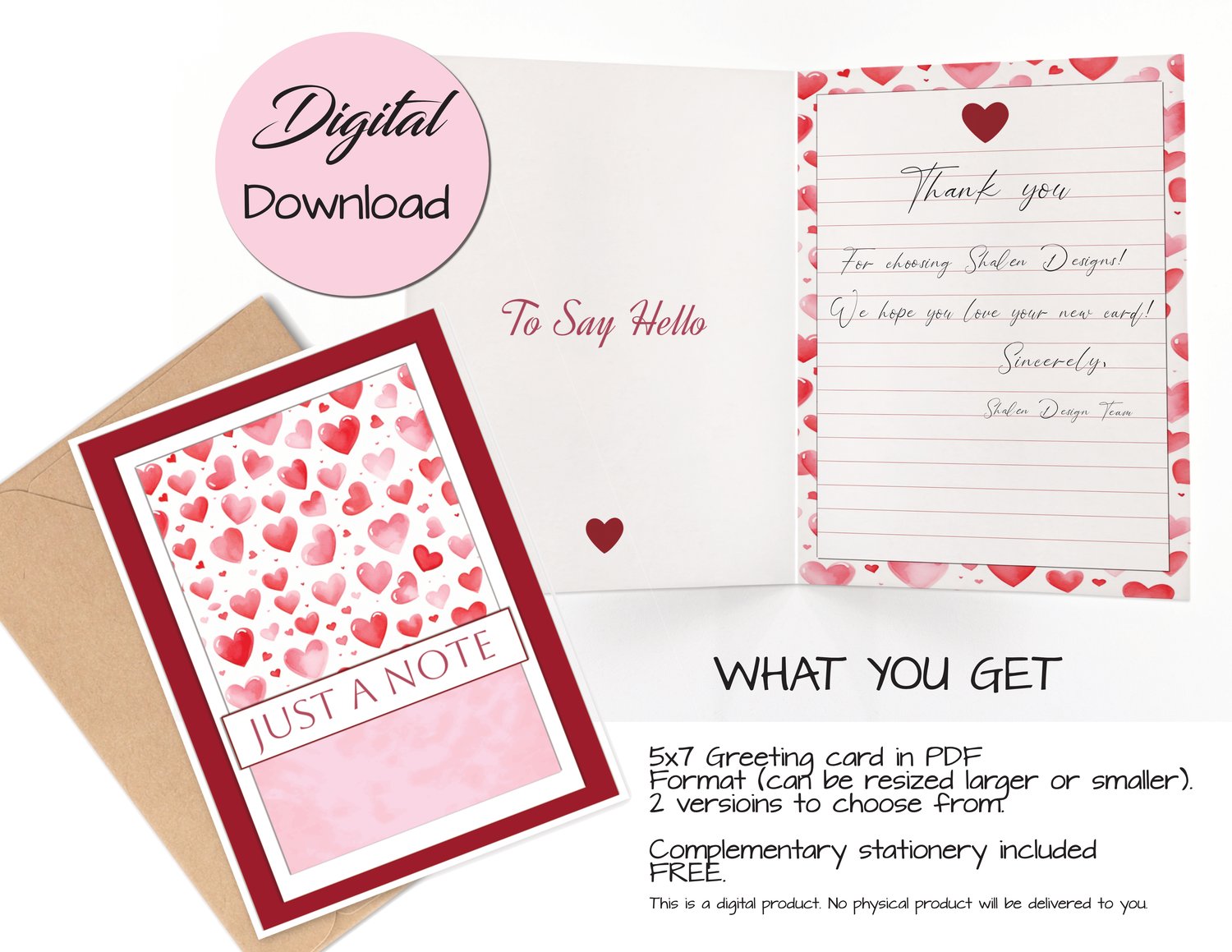 Express your affection with this elegant greeting card, adorned with a cascade of watercolor hearts, perfect for any heartfelt message. The “Just A Note” banner adds a touch of sophistication, making it suitable for various occasions