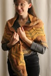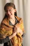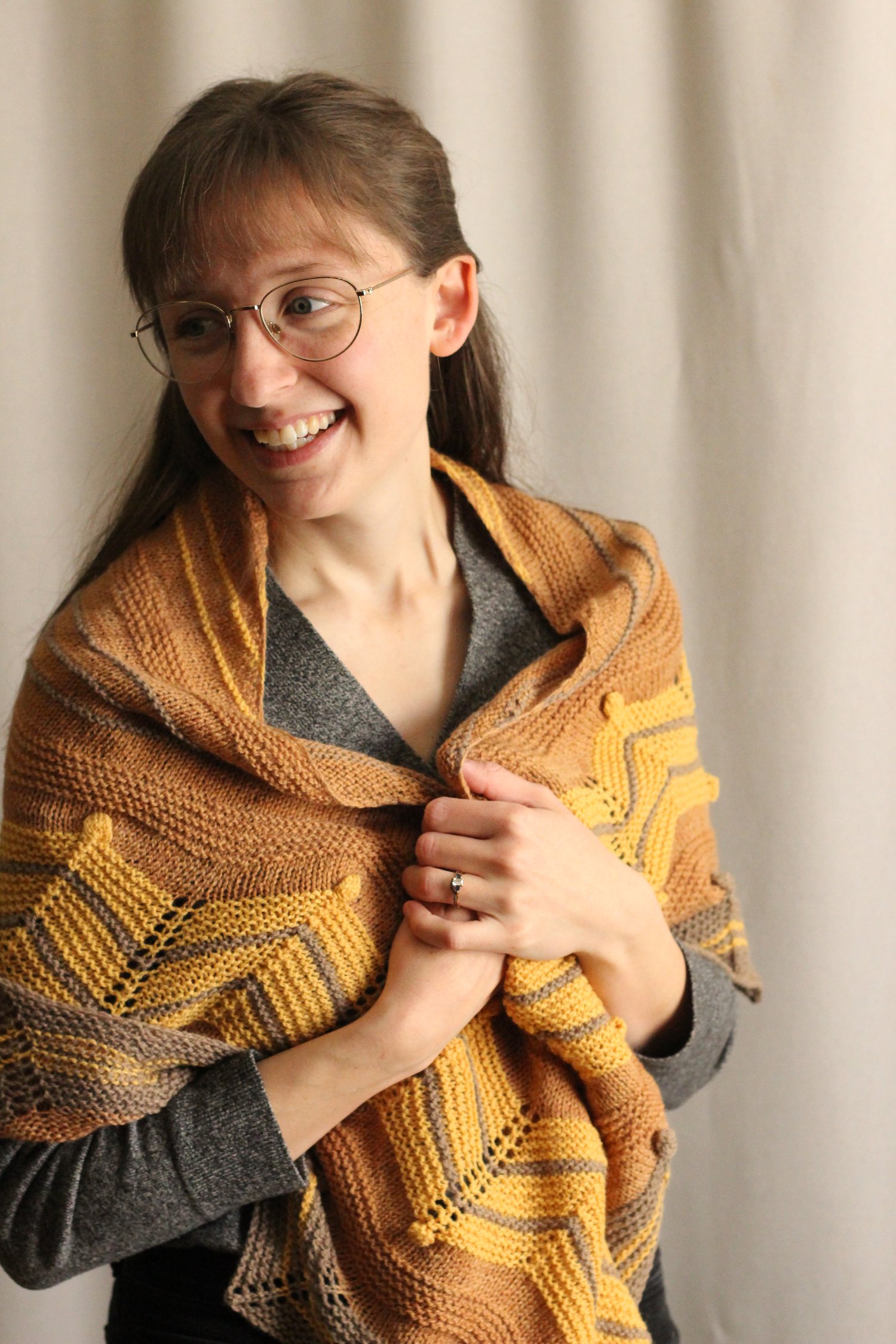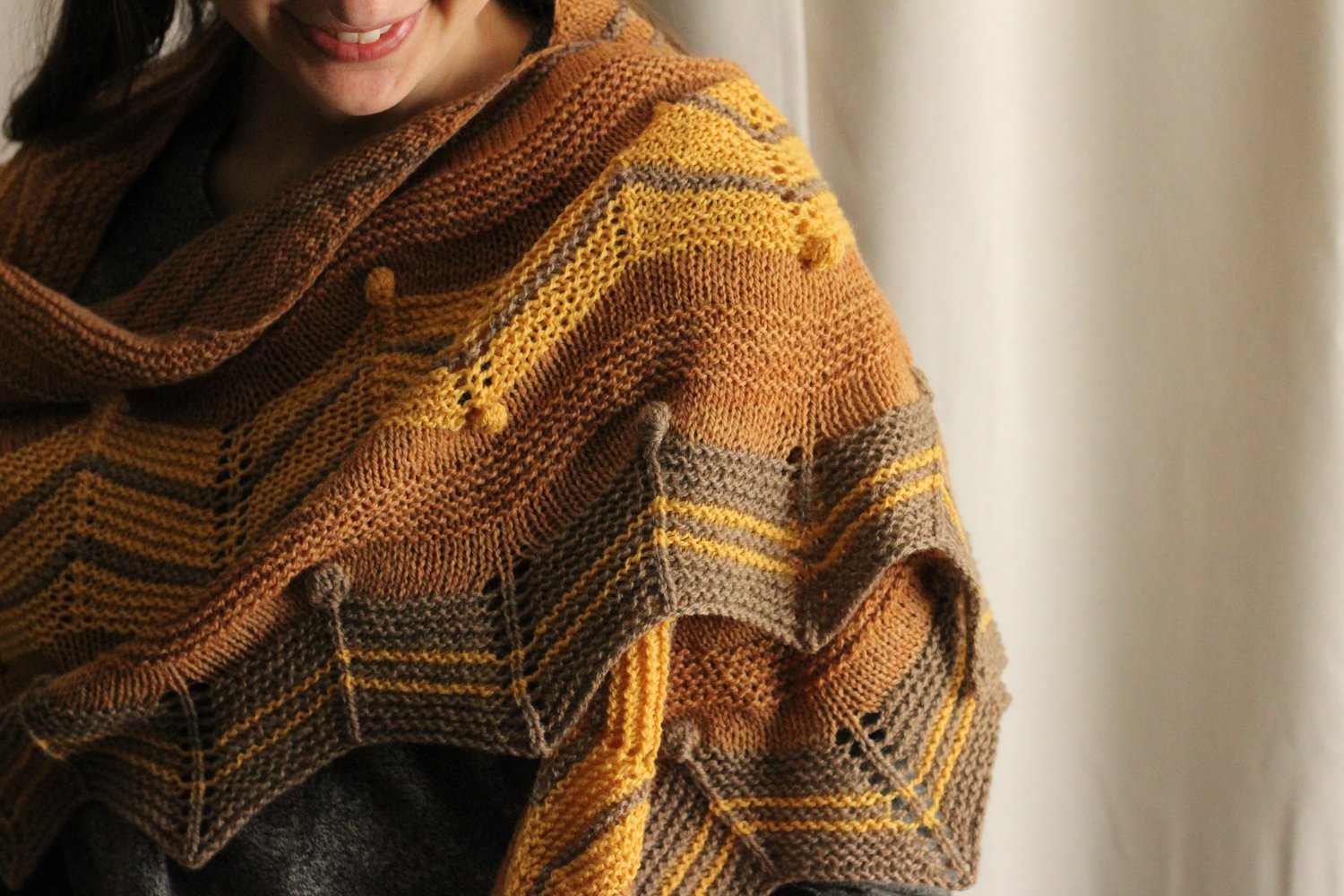 The Rosie Cotton shawl is inspired by the hobbits of J.R.R. Tolkien’s The Hobbit and The Lord of the Rings. The simplicity of the design and the natural beauty of the yarn echo the simplicity of the hobbits and their connection to good, solid earth. At the same time, hobbits have a joyful spirit of fun about them, too, and the playful touches of bobbles and chevron stripes sing of their ability to have a good time. The shawl uses conventional shaping to achieve a lovely crescent shape that drapes nicely over the shoulders. With a nice mix of stockinette and garter, it is quite enjoyable to knit; just engaging enough to stay interesting without requiring too much brain power.