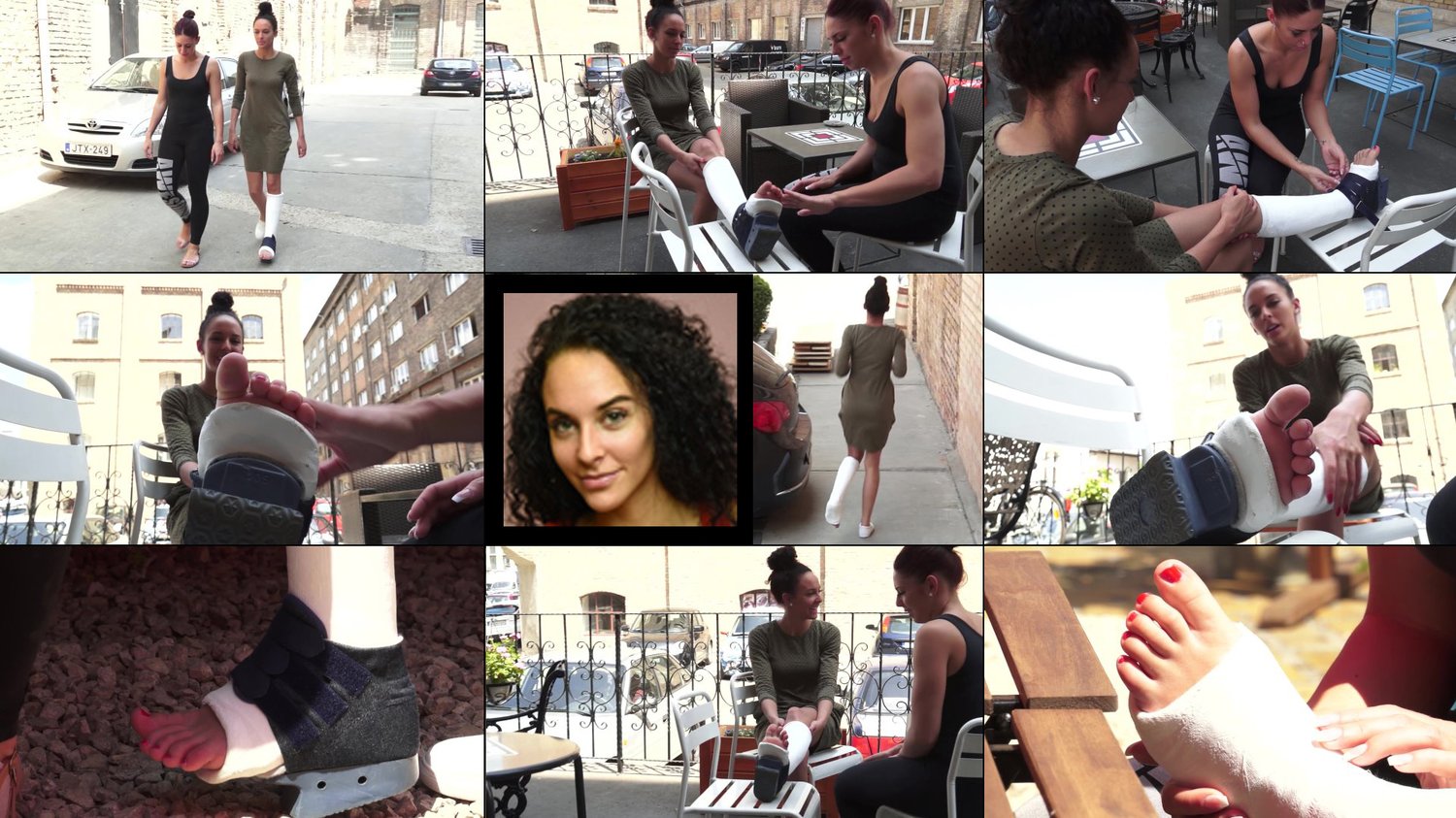 With her vacation already scheduled before her accident Rita is trying her best to get around on warm sun-drenched isle in her heavy sweaty leg cast. She is having issues though especially with her exposed toes sticking out of the cast on all the concrete and cobblestone. So on her crutch down to the promenade overlooking the bay she has to stop often to check her toes and massage them on a bench, on a railing and on the pier. (Directors Cut with more Foot Play and Crutching).