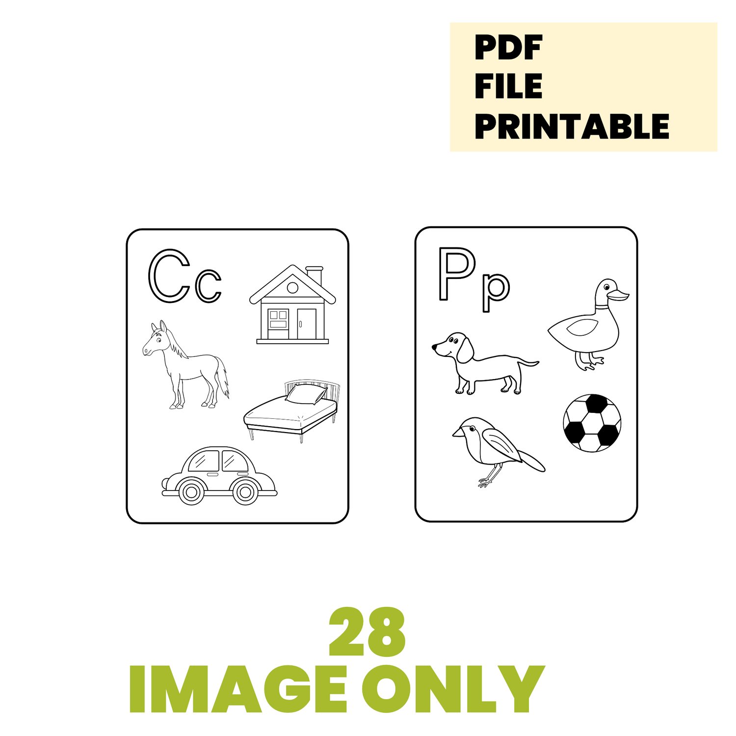 Perfect for reviewing vocabulary with kids. This ABC coloring sheets in spanish set contains 56 coloring pages with common words. Each page features an uppercase and lowercase letter from the Spanish alphabet, with accompanying images such as animals, plants, or objects.
