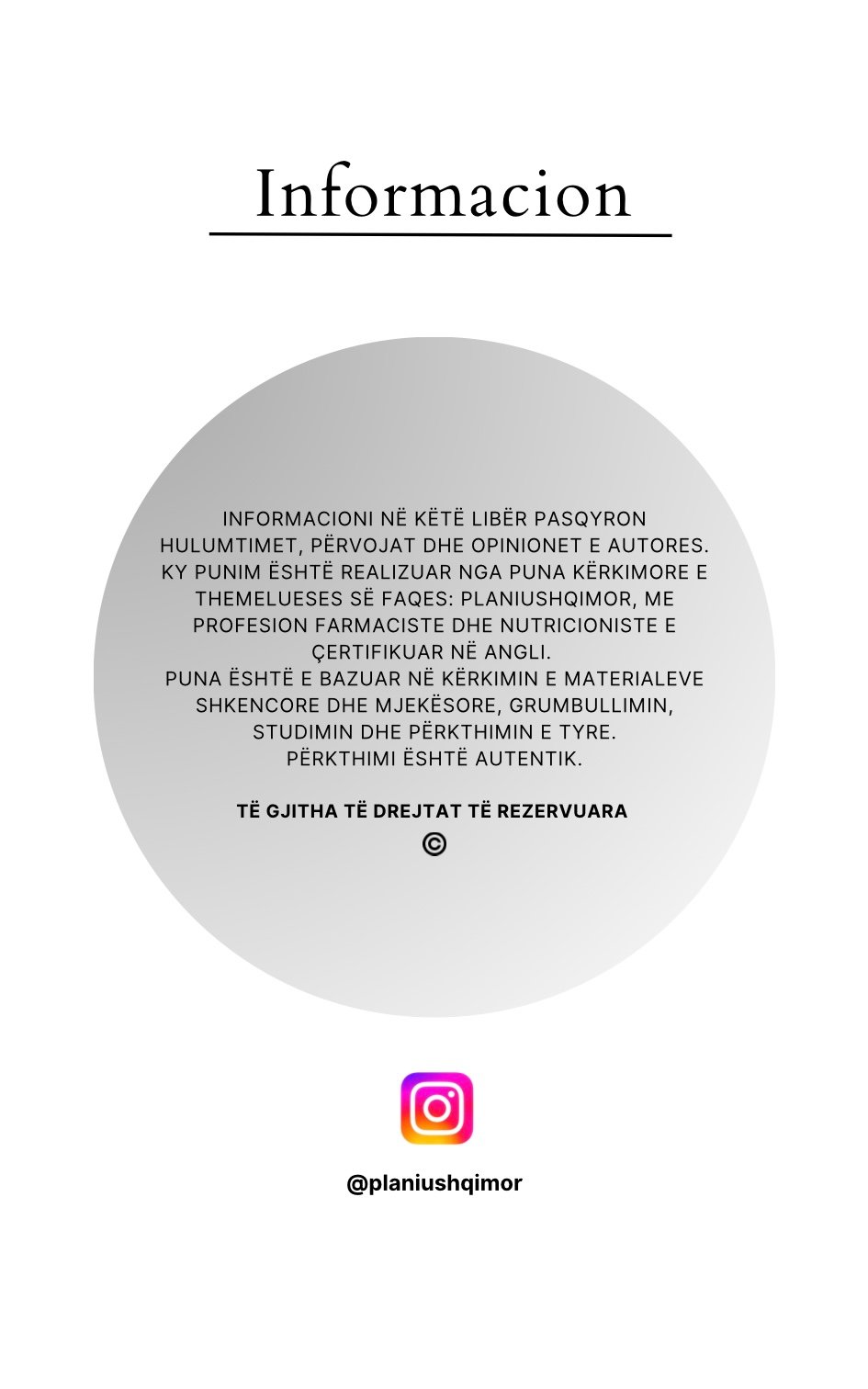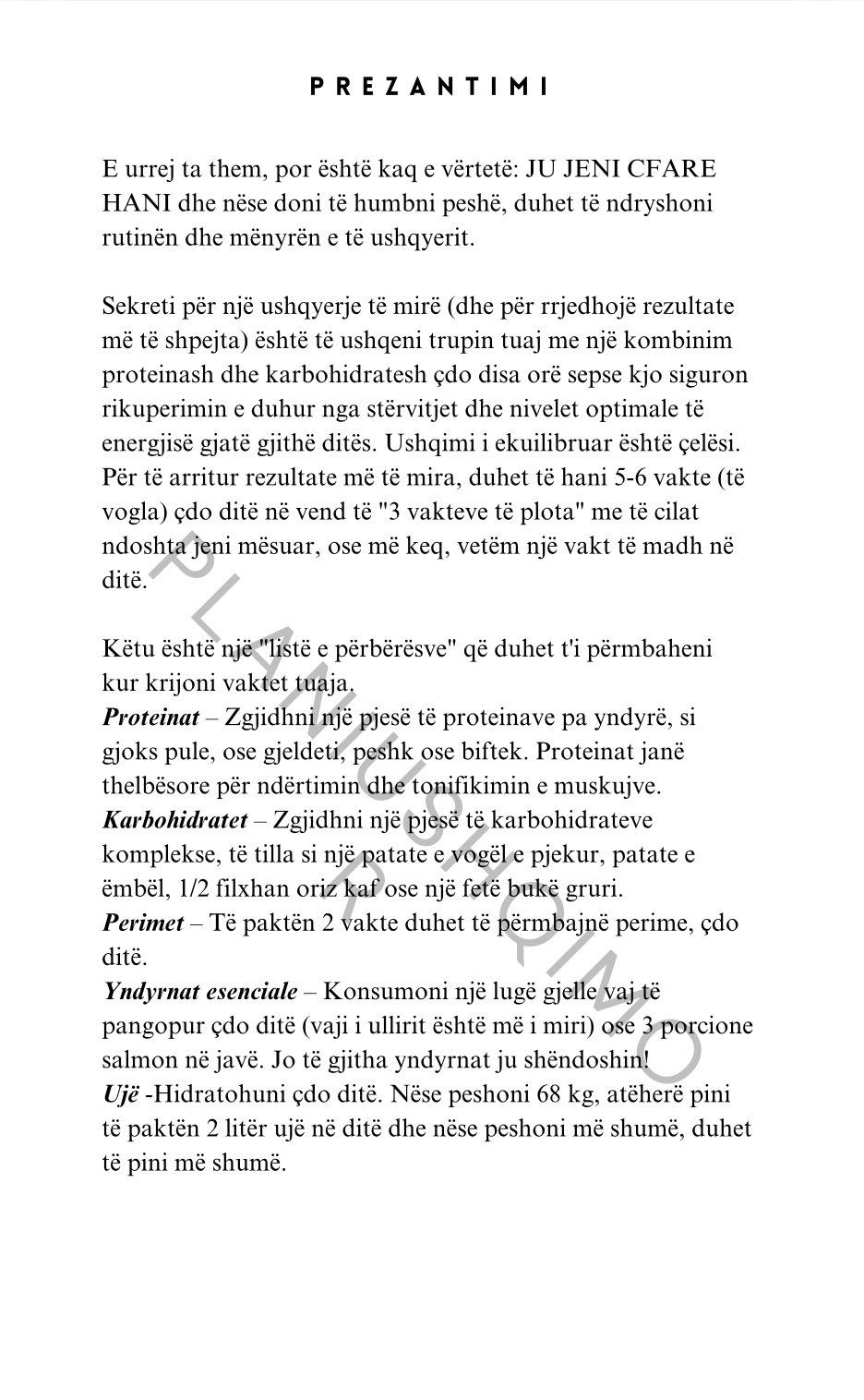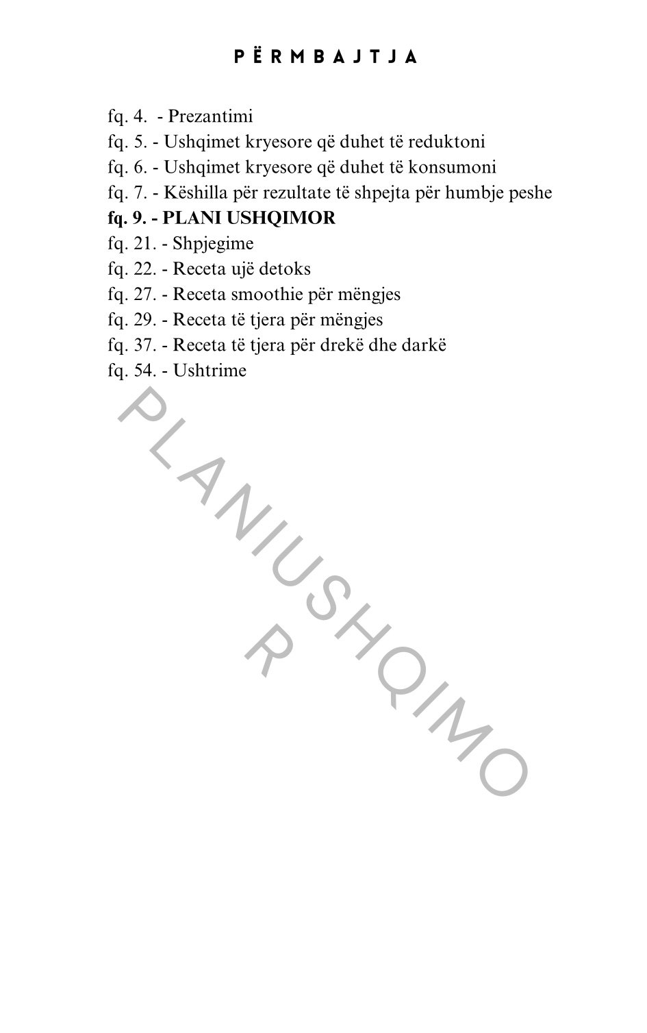 Plani ushqimor me mbi 120 receta per vaktet kryesore (mengjes, dreke dhe darke) dhe mbi 50 receta per mesvaktet tuaja te cilat ju ndihmojne te reduktoni kilogramet e tepert ne menyre te shendetshme pa nevojen e dietave drastike apo suplementeve te shtrenjta.