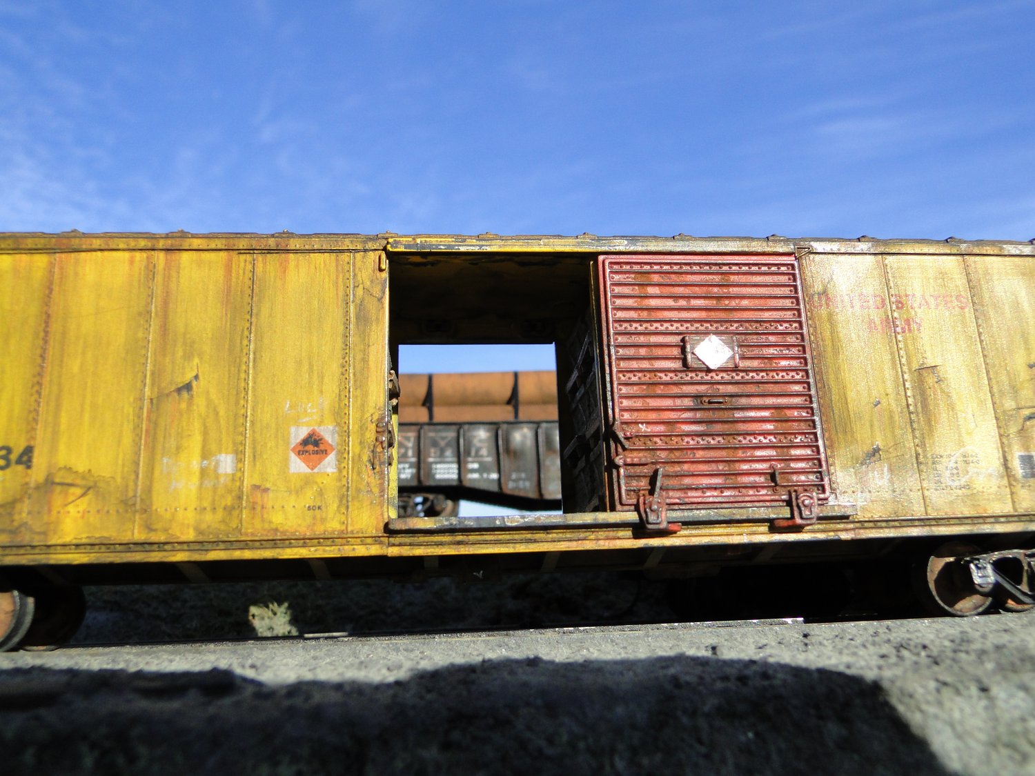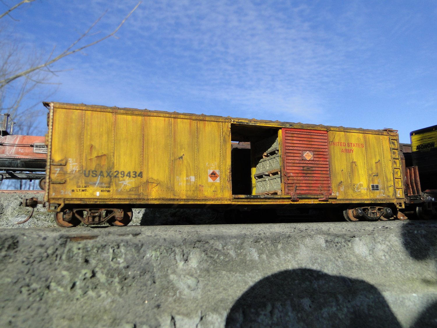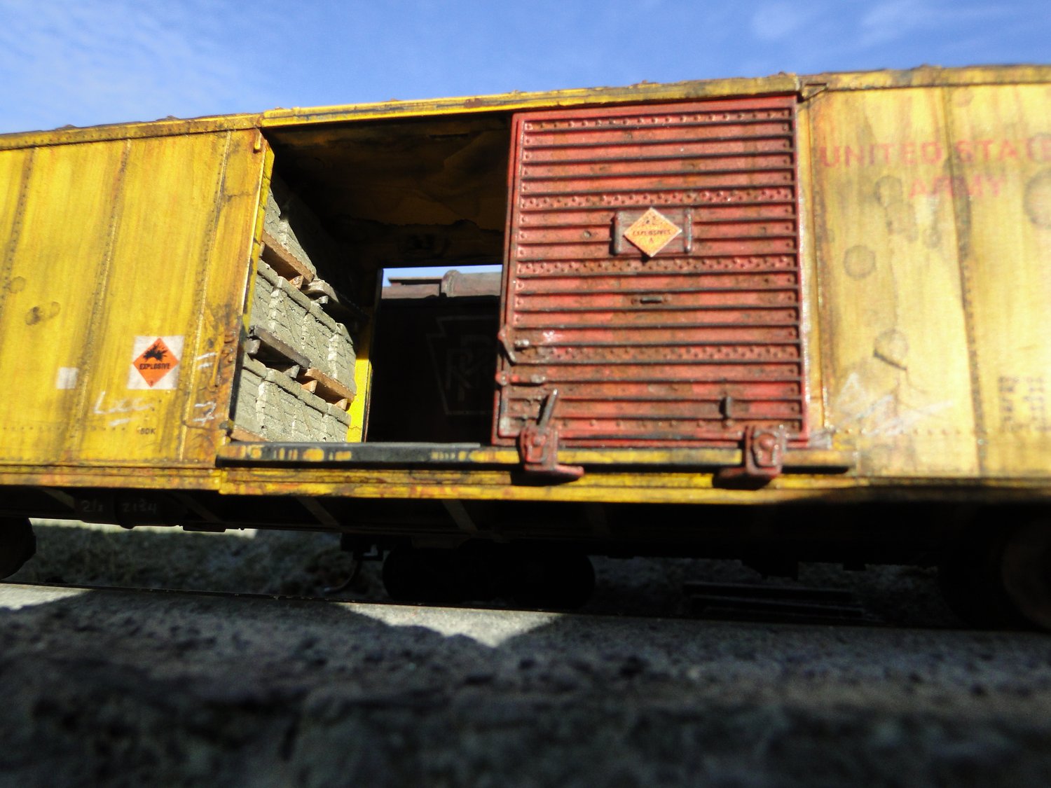 United States Army USAX explosive single door boxcar 29434. Kadee whisker couplers, Kadee flat back wheels, Kadee coupler boxes, galvanized roof paint failure, steel grate roof walk, prototypical brake wheel, wooden laser cut wooden floor, weathered tack boards, weathered underframe, hand painted weathered crate loads, chalk marks, sliding door scratches, wheel end splash, routing tags, prototypical placards, painted glad hands.