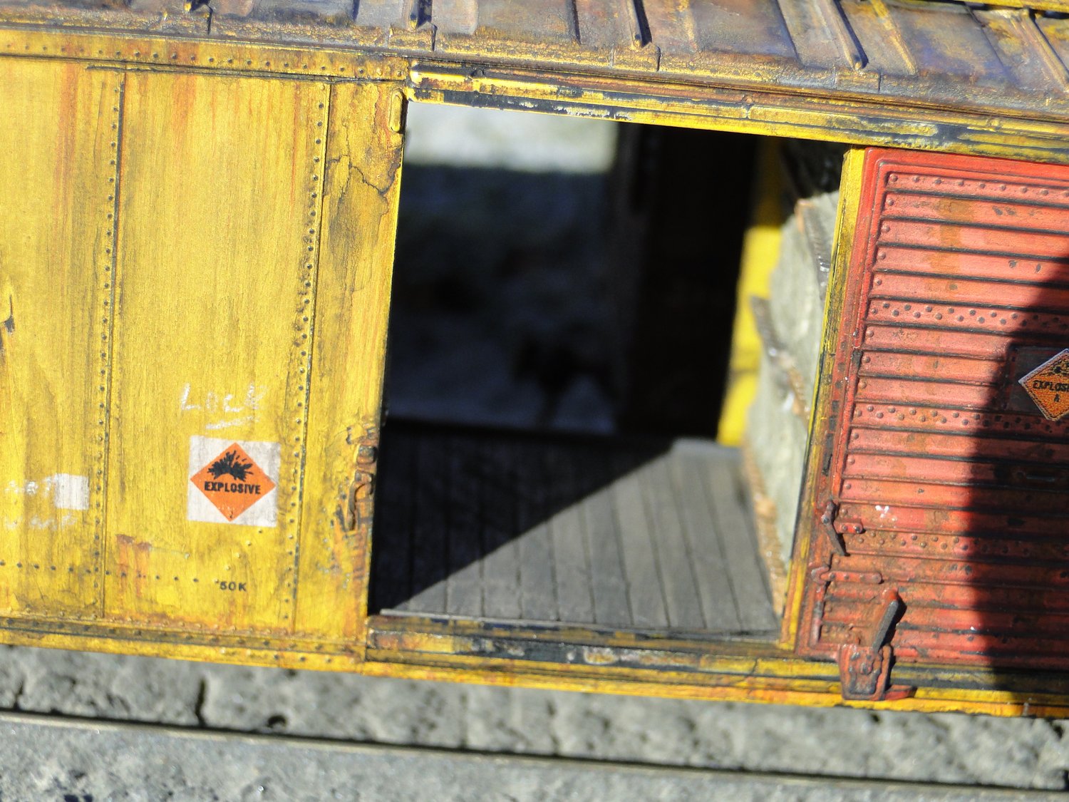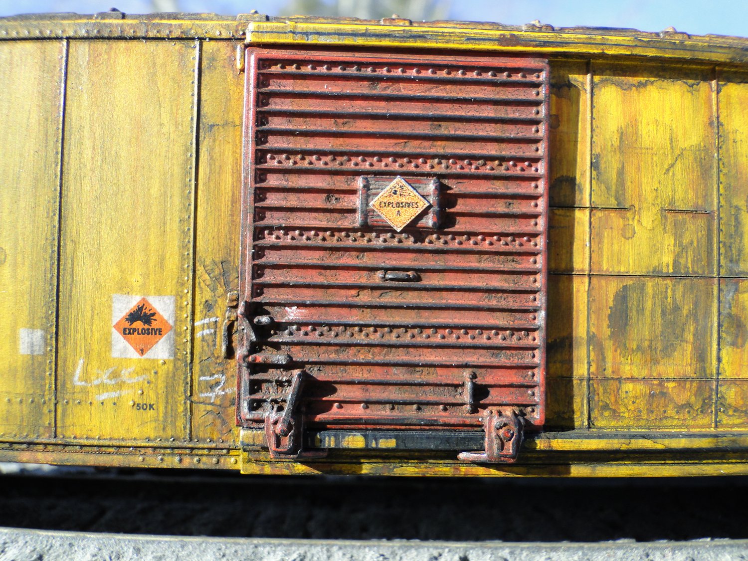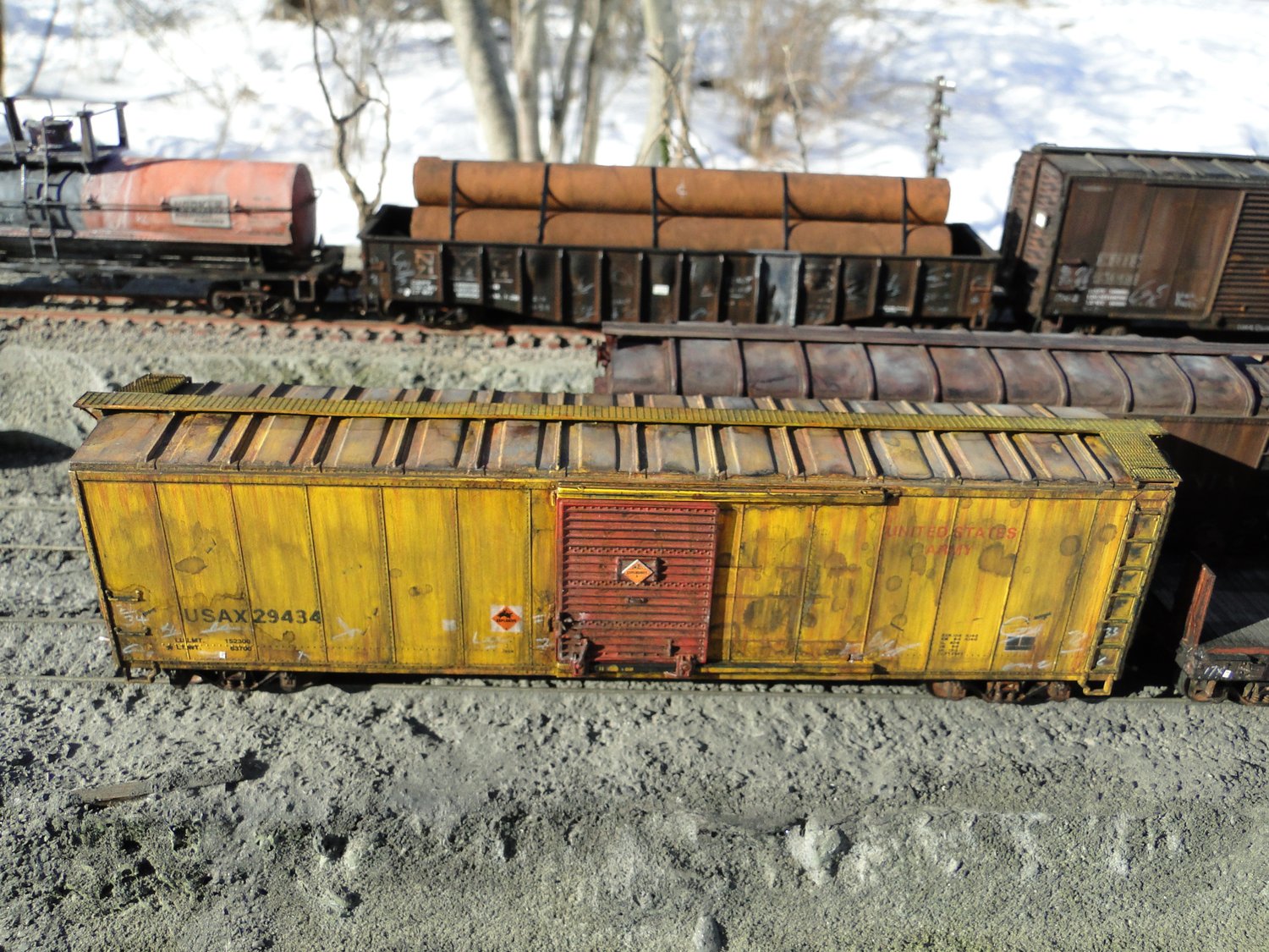United States Army USAX explosive single door boxcar 29434. Kadee whisker couplers, Kadee flat back wheels, Kadee coupler boxes, galvanized roof paint failure, steel grate roof walk, prototypical brake wheel, wooden laser cut wooden floor, weathered tack boards, weathered underframe, hand painted weathered crate loads, chalk marks, sliding door scratches, wheel end splash, routing tags, prototypical placards, painted glad hands.