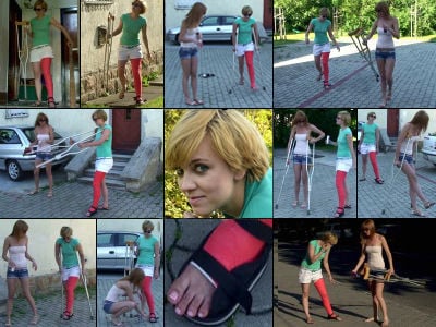 Cassidy is crutching in the park getting used to her crutches but needs to find a bench to rest. As she sits with her legs propped up wiggling and curling her toes, her friend arrives and is fascinated by Cassidy's cast. She notices how cold her exposed long toes are and offers to massage them. After a long scene of toe massage with POV and closeups they crutch over to a monument of a car accident. This gives Cassidy some flashbacks as that’s where she got her cast, in a car accident. After reading the monument Cassidy props her casted leg up on the crumpled car and decides its more comfortable to sit down on it with her leg propped up (more POV and closeups) and her friend once again massages her cold toes. And they continue their crutch in the park. This is a must-see clip featuring an excellent balance of crutching, foot play and POV closeups. (This verison about 30 seconds longer with more crutching)