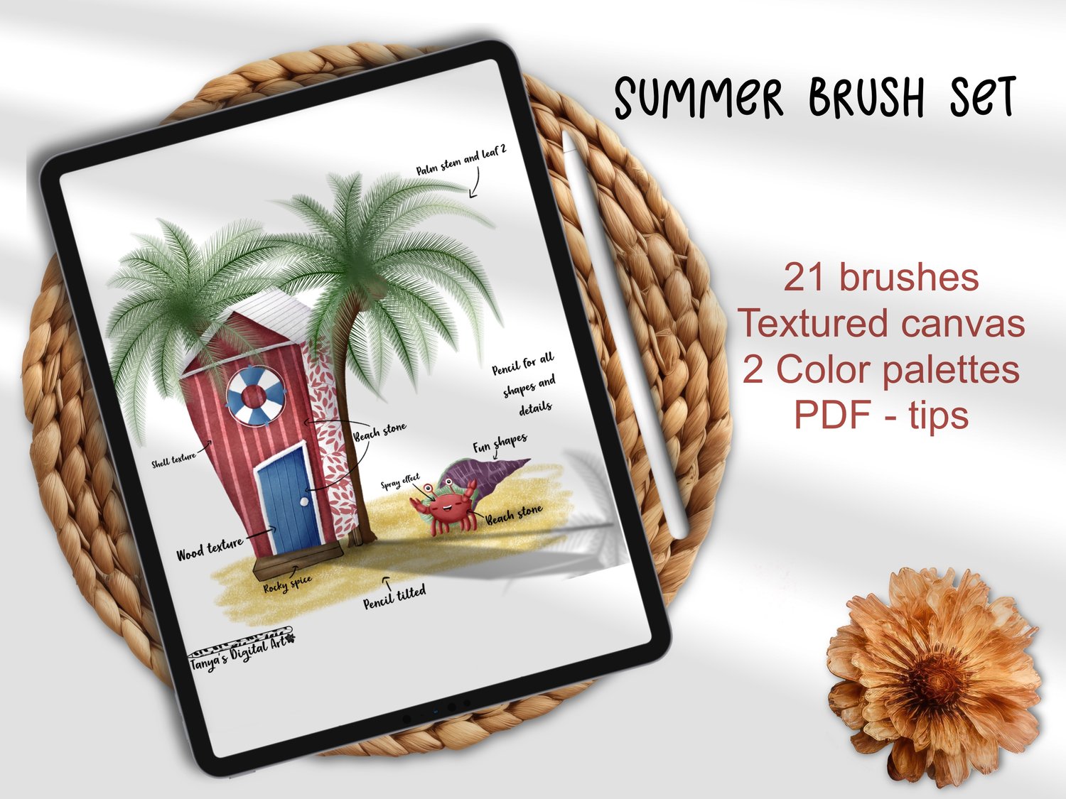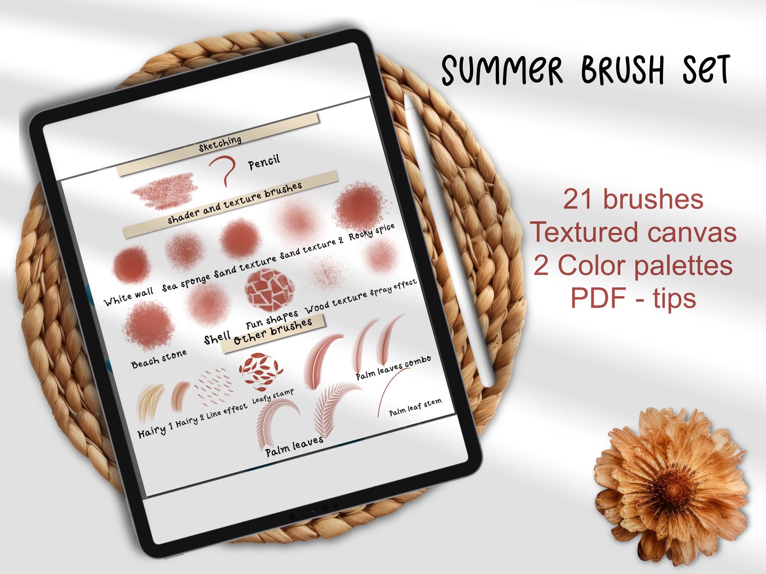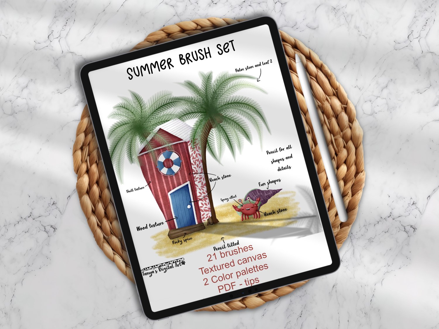 This is a set of fun summer brushes individually made by me, inspired by a recent trip to the beach. All brushes were hand drawn and turned into brushes just for you. The texture brushes are made from personal photos I took at the beach.