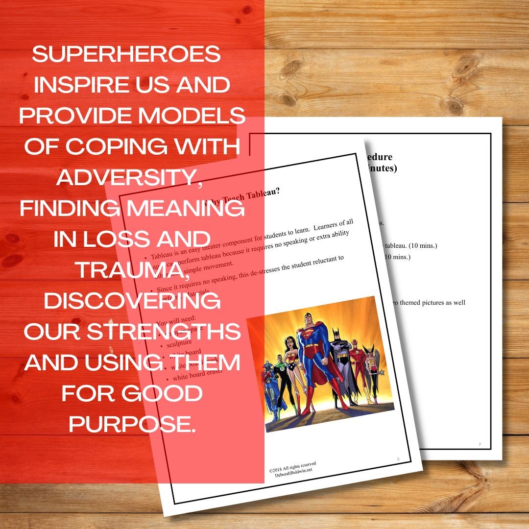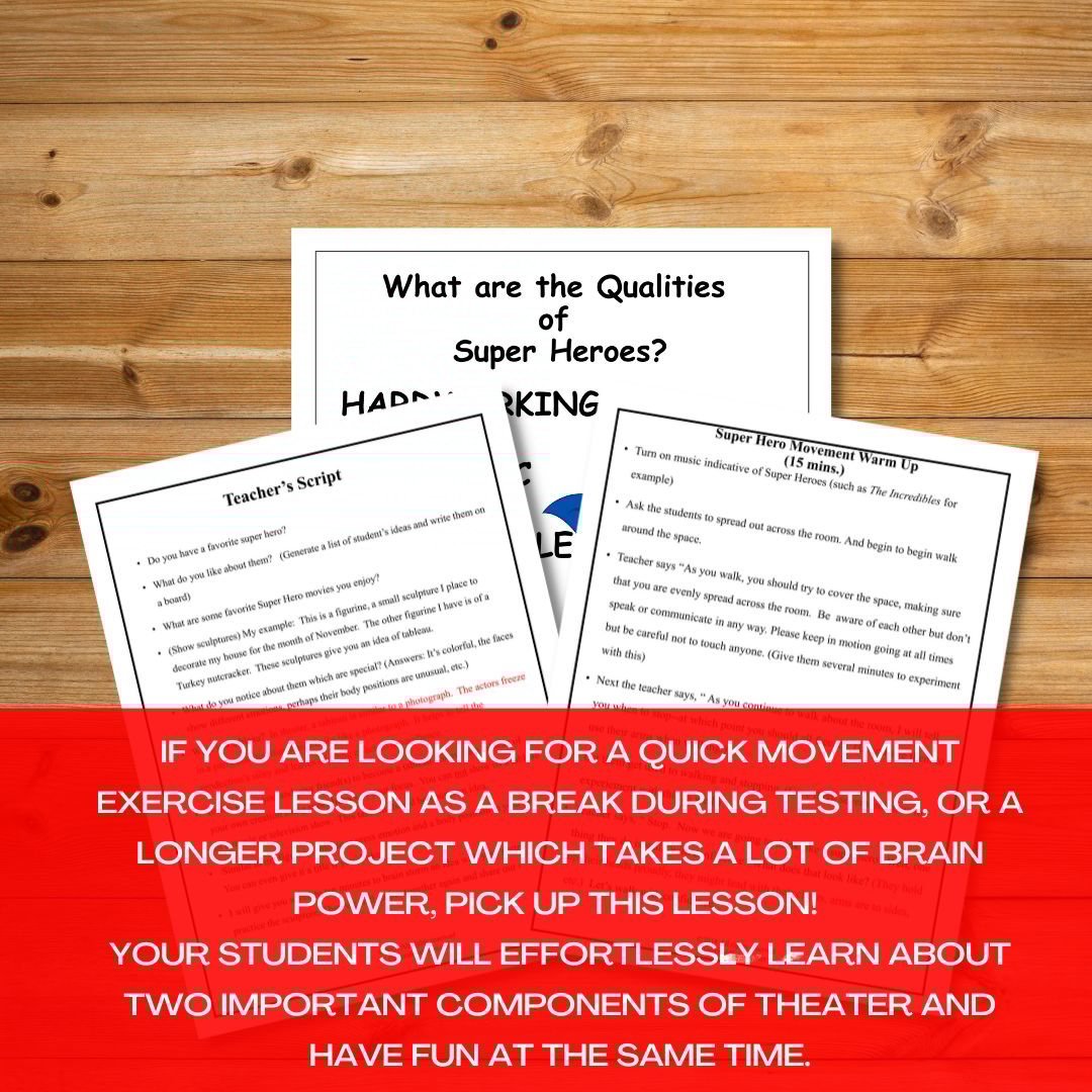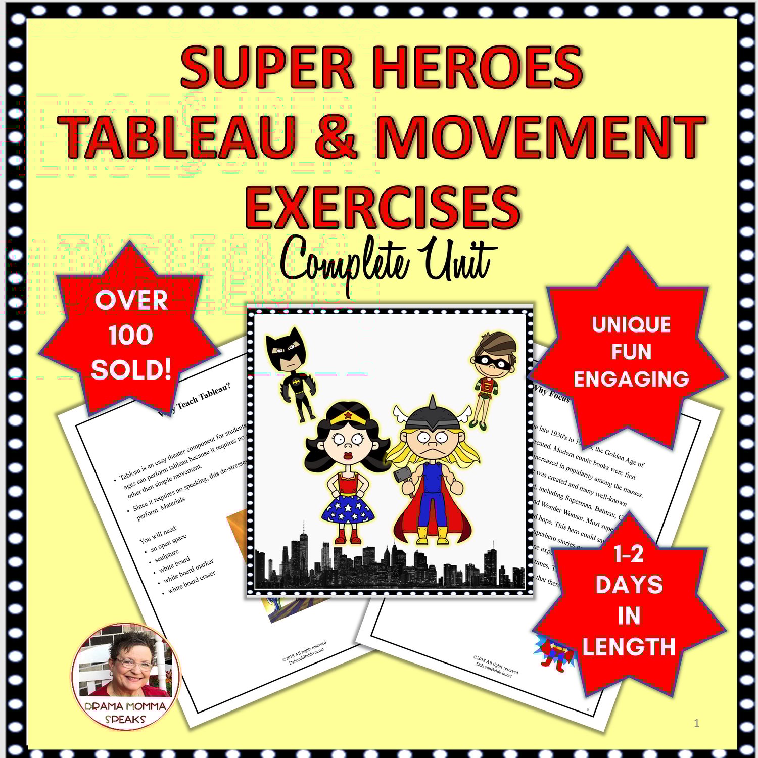 It's a bird, it's a plane--no it's students loving super heroes! Over 125 Sold! Tableau and movement are elements of theater any student can learn and perform successfully, especially grades 5-7. This low prep lesson teaches important two elements of theater using super heroes as the focus. Talk about fun, unique and engaging! This was created as a one day lesson, but can easily be extended another day.