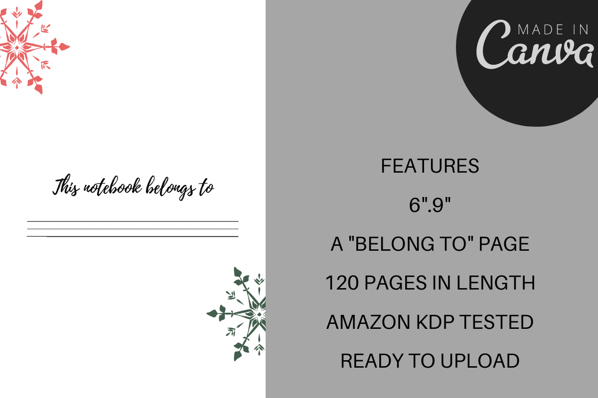 Improve your mental health by getting your desires, emotions, fears, and positive self affirmations out on paper. This journal interior is the first step in boosting your mental health and it's so cute you won't want to put it down. It is a 6" X 9" lined paperback Christmas notebook with 120 white pages and each page contains a header for titles or dates. This interior is perfect for creating professional-looking interiors for journals, notebooks, and other low-content books that require lined pages. This interior is fully formatted, ready to upload and compatible with Kindle Direct Publishing (KDP) guidelines, ensuring that your book will meet the requirements for publishing on KDP.