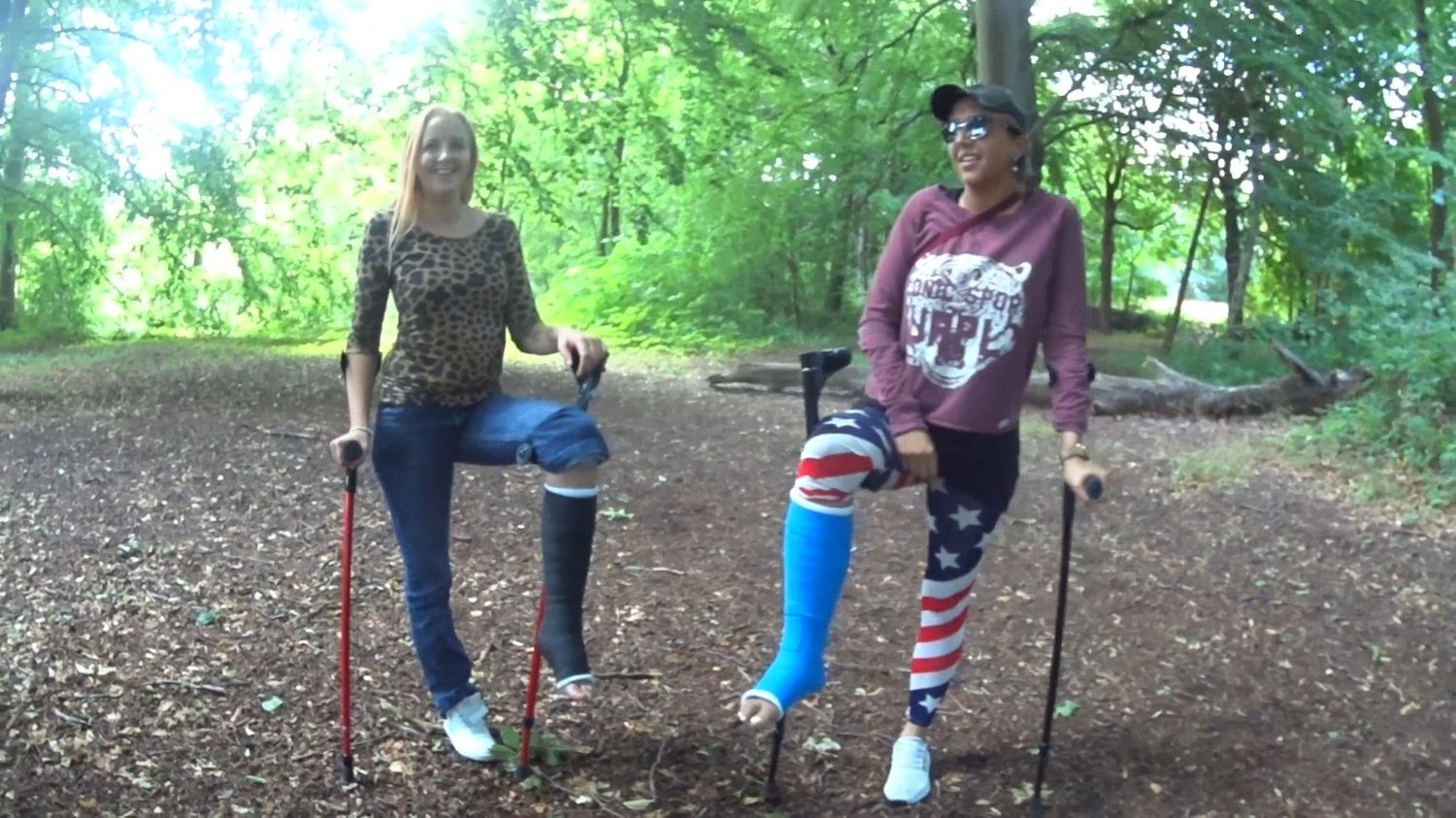 Alva and Bella crutch away into the woody parts of the park, with each of their own SLC. Both, Alva and Bella, proudly display each of their own SLC in black and purplehanging their leg from the crutches as we get a short closeup of both cast. As Bella and Alva joke around they use the crutches on each other as swords in a crutchfight. The two crutching friends laugh a bit before continuing crutching around in nature.