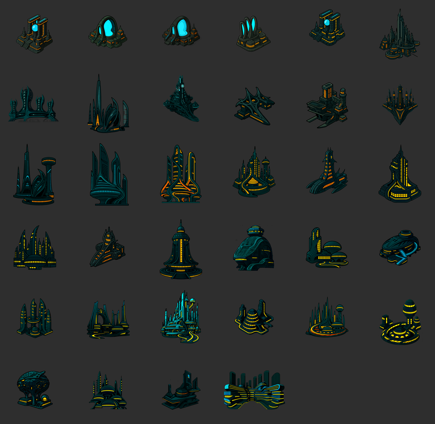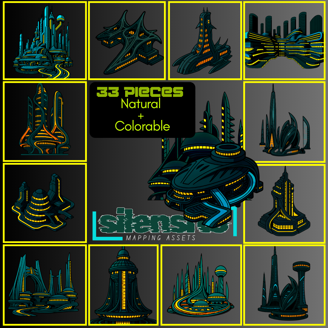 - 33 pieces of large-scale cityscapes, including urban clusters, landmark districts, megastructures, and futuristic hubs.
