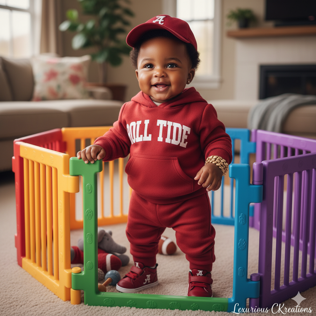 - 👦 Boy Prompt: Baby boy with a crimson cap, hoodie, jogger pants, sneakers, and Roll Tide toys inside a playpen.
