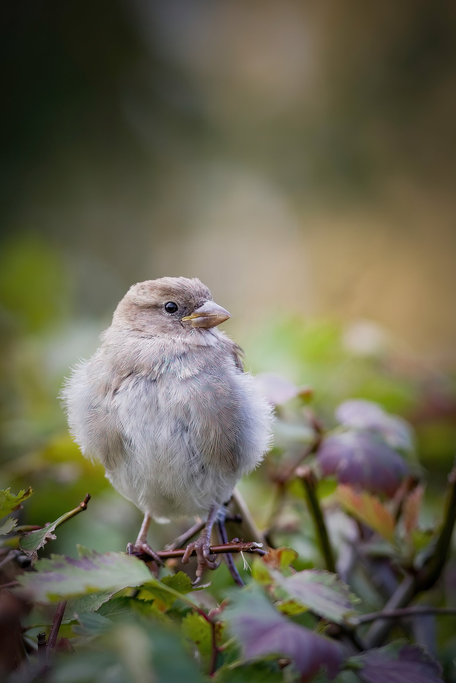 A young Sparrow (Passer domesticus) on a hawthorn fence.