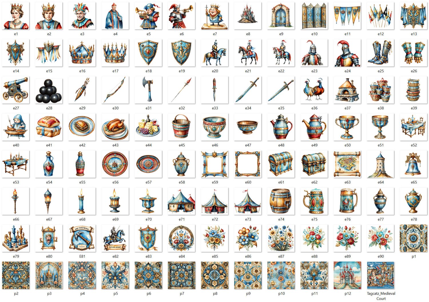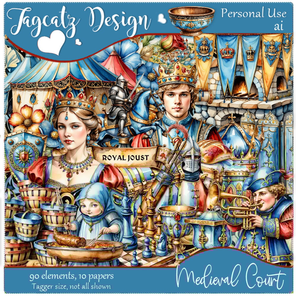 Royal court in medieval times with feasting, jousting and other passtimes. 90 elements and 12 matching papers. AI generated. Tagger size. Not all shown. Personal use only.