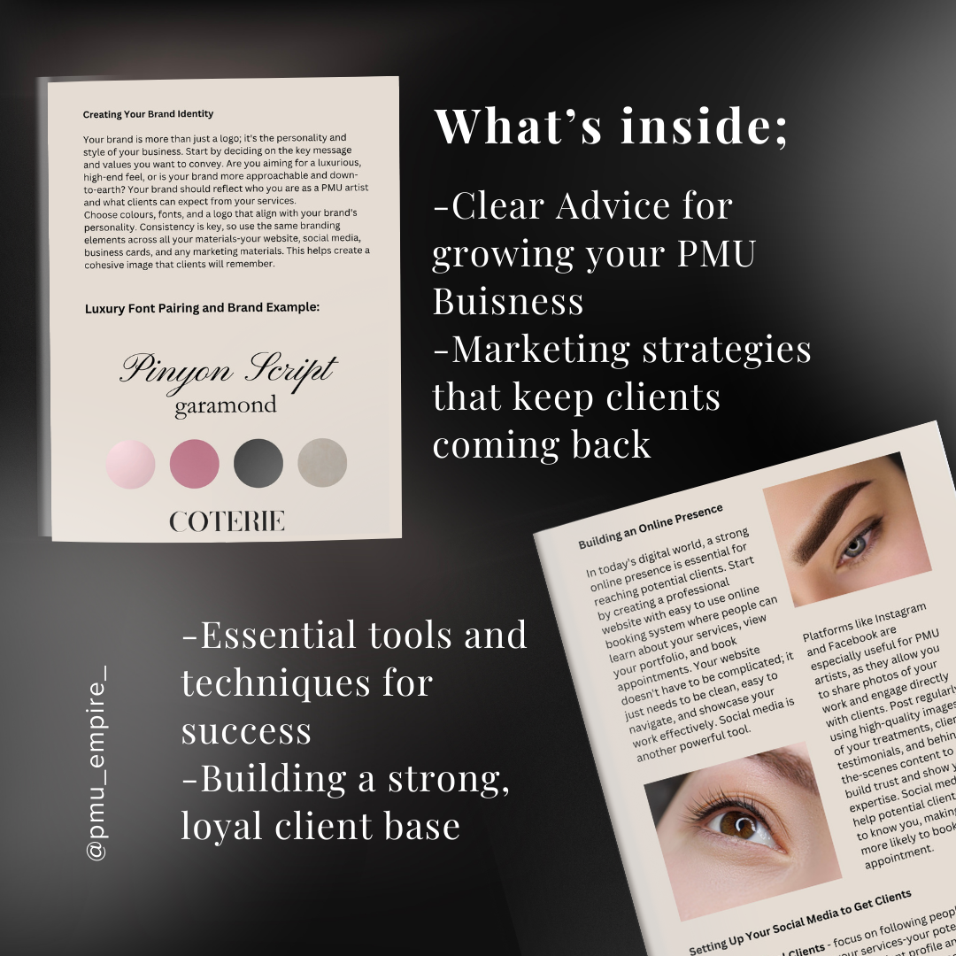Created by an award-winning PMU artist with over 13 years of experience, this comprehensive guide covers everything you need to know to launch and grow your PMU business.