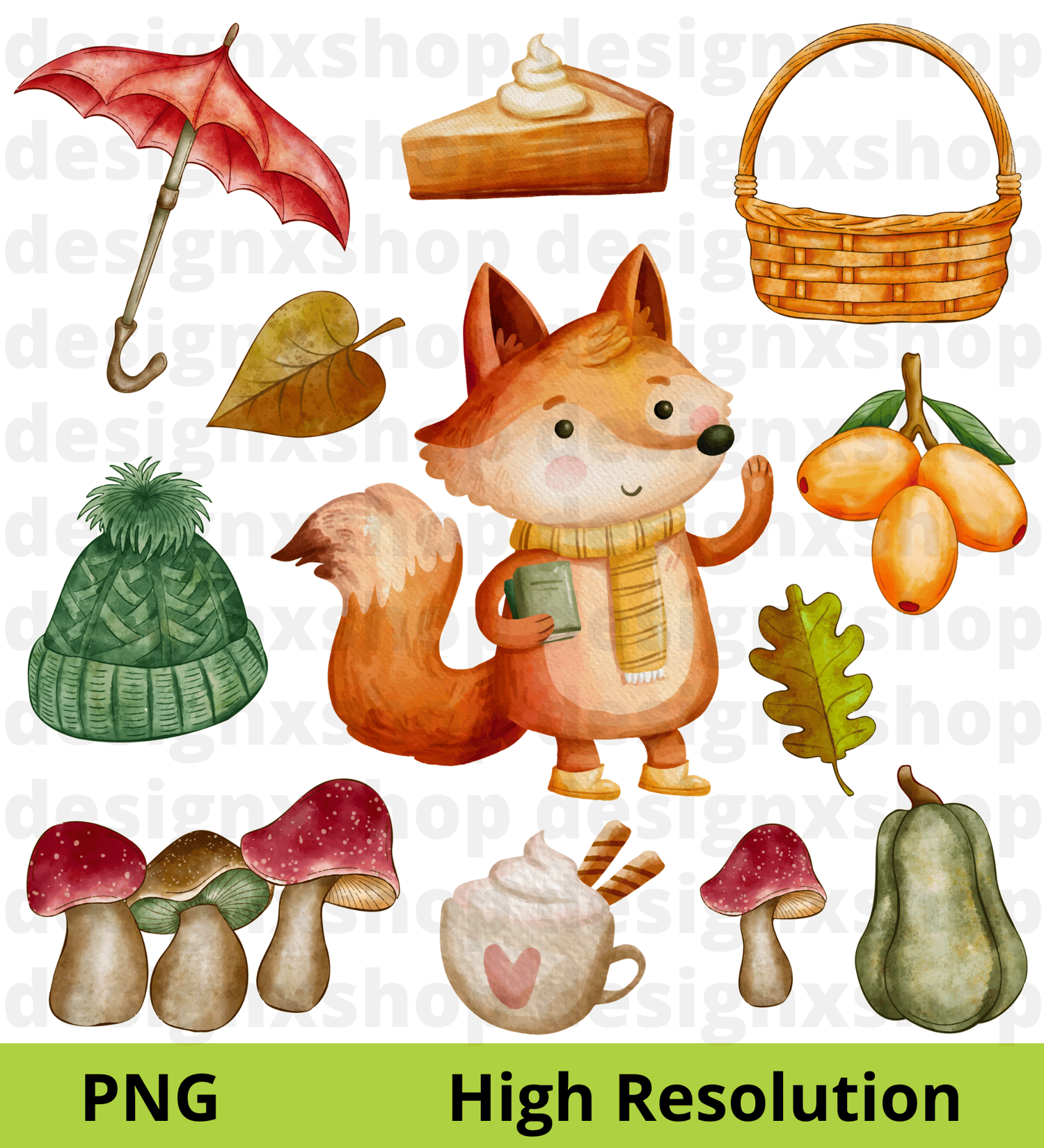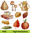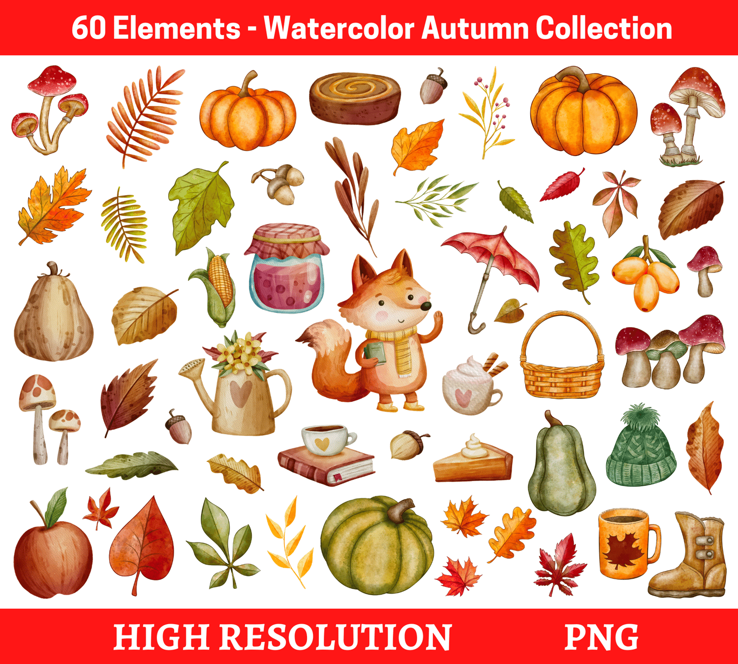 60 Elements - Watercolor Autumn Collection, hi-res digital CLIP ART (with transparent background).