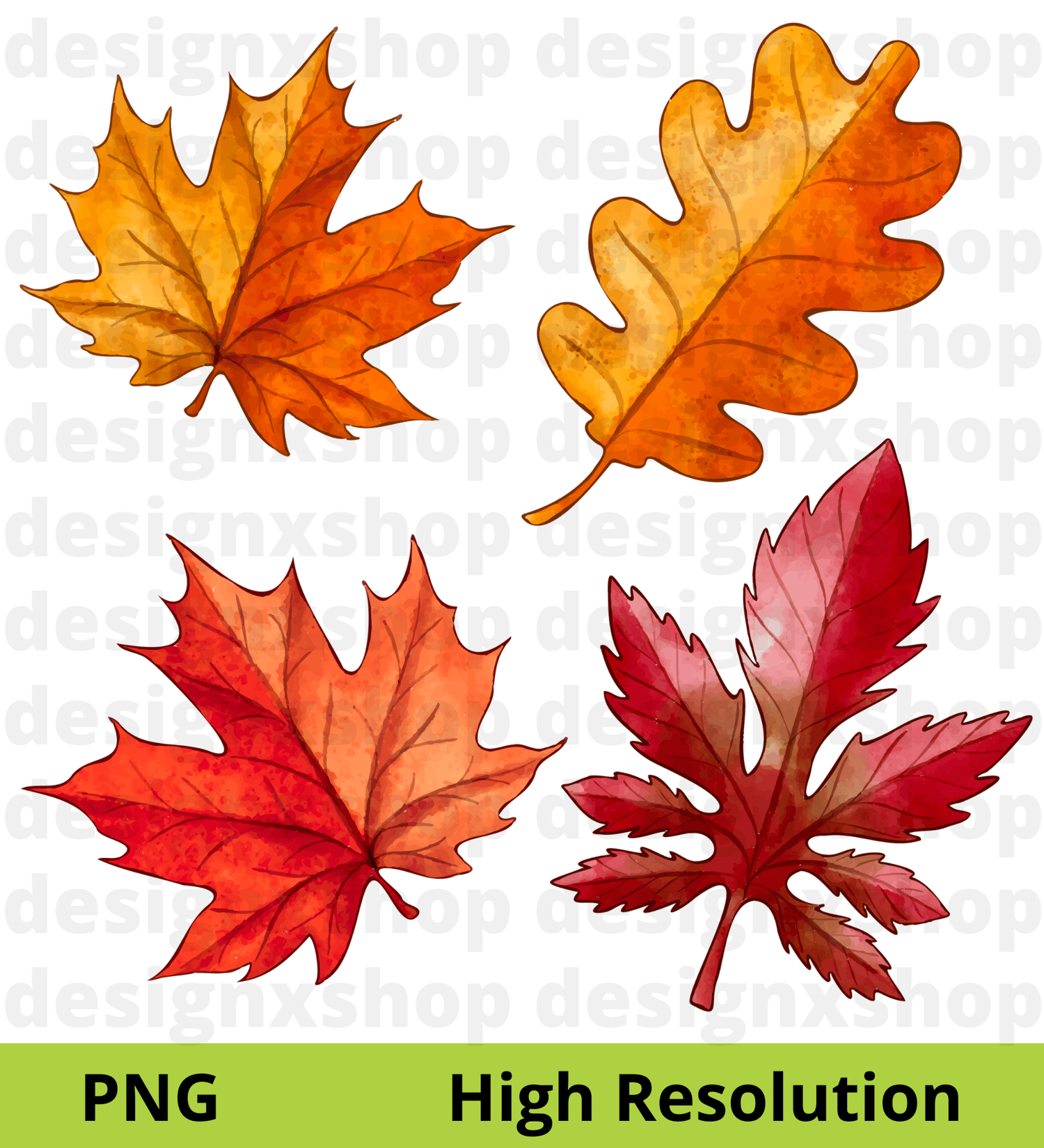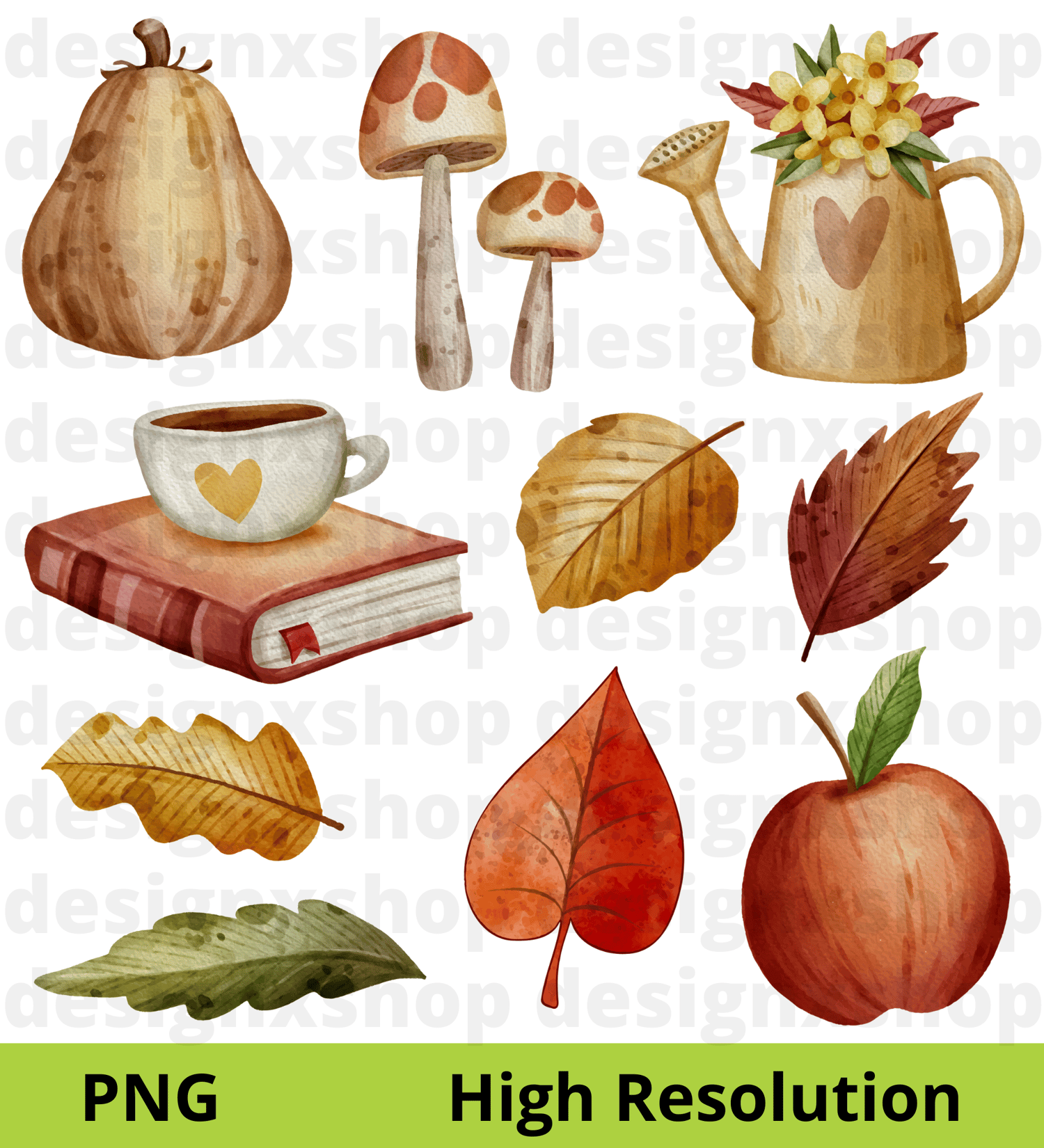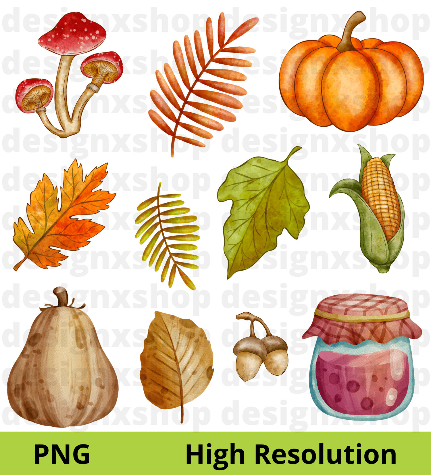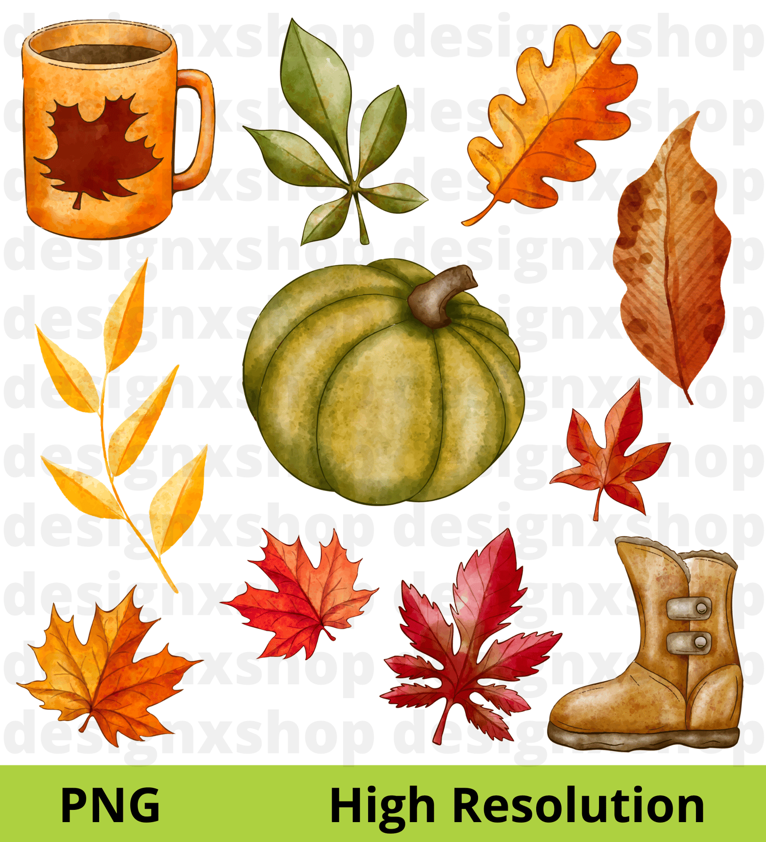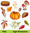 Watercolor Autumn Clipart: Fall Leaves, Pumpkin PNG (60 Elements) (Digital Download)