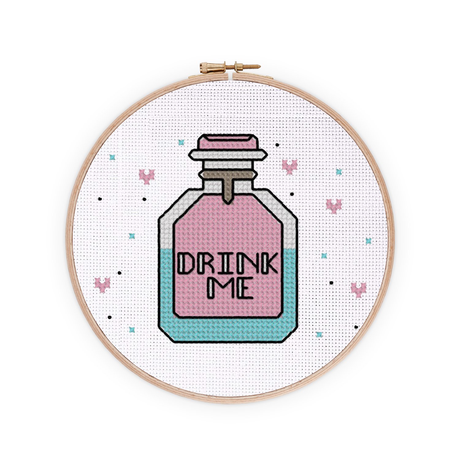 This 4 page cross stitch downloadable pdf pattern comes with the instructions you need to embroider a modern piece of stitched artwork for your home or nursery. This beautiful cross stitch in drink me design is the perfect project for stitchers of all abilities. As well as an enchanting piece of art it also makes a meaningful gift for children, adults, friends and family who enjoys doing handmade craft. Why not print and file away for you to use again and again?