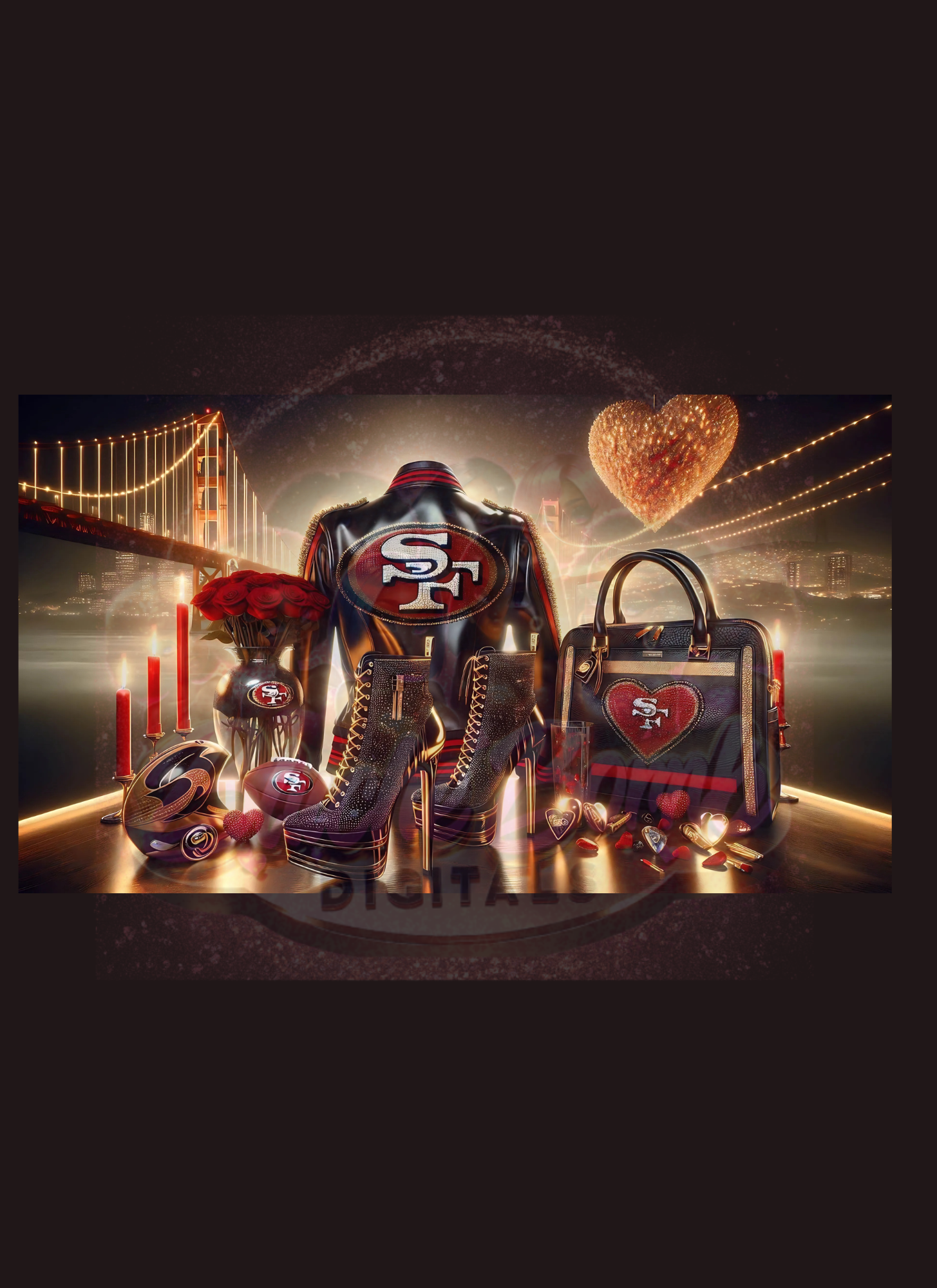 Elevate your game day spirit with this luxurious San Fransico 49ers-inspired fashion and decor digital artwork. This high-quality PNG features an opulent display of Niners-themed fashion items, including a sleek jacket, chic handbag, and stylish boots, all set against a backdrop of golden accents and glowing lights. Perfect for creating standout sublimation prints, digital projects, or unique game-day decor!