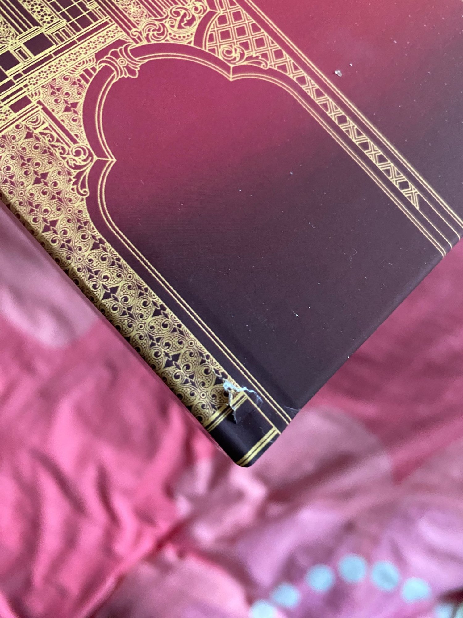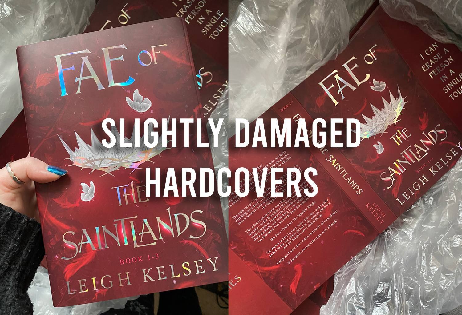 A *damaged* special edition hardcover of Fae of the Saintlands, signed by the author, with shipping to most places in the world! Comes with free swag and a vellum insert (while stocks last.)