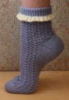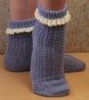 As a child, I used to love reading vintage boarding-school stories, and always imagined that the girls in them would wear cute little ruffled socks while eating their midnight feasts and drinking ginger beer. The Bobby socks are the first in a series of sock patterns: the Midnight feasts collection, which pays homage to these books with a series of cute ankle socks, all featuring a frill around the cuff: show them off by wearing them with circle skirts and Mary-Jane shoes, or let the cuff peep out of the top of a pair of ankle boots for a really cute look. All the socks in the collection are knitted from the top down using a standard heel flap and gusset construction. The ruffled frill and first half of the turned-back cuff are knitted first, then inverted using a short row before knitting the rest of the sock. The foot length of the socks is adjustable to fit.