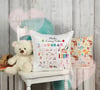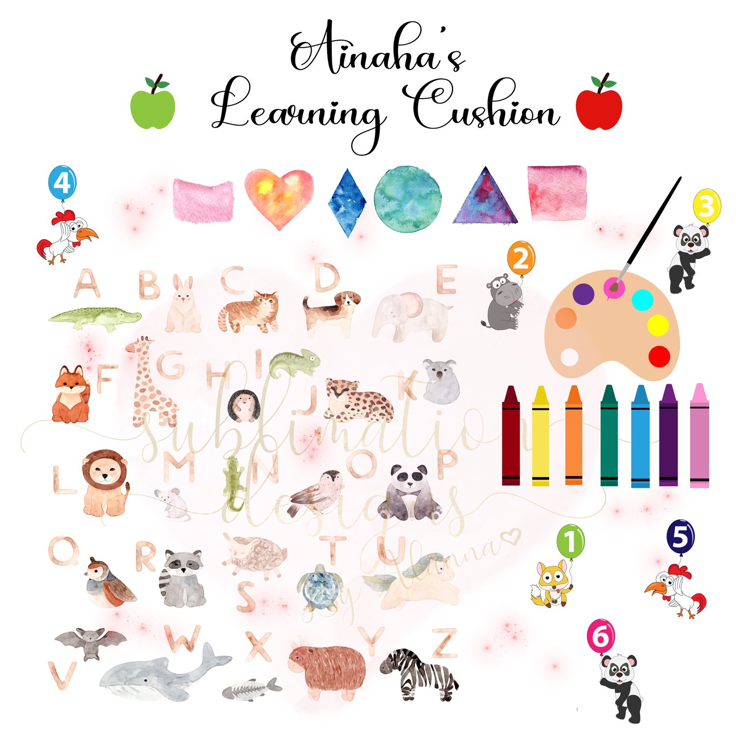 Learning Cushion Mockup includes colours, animal alphabet, shapes and counting