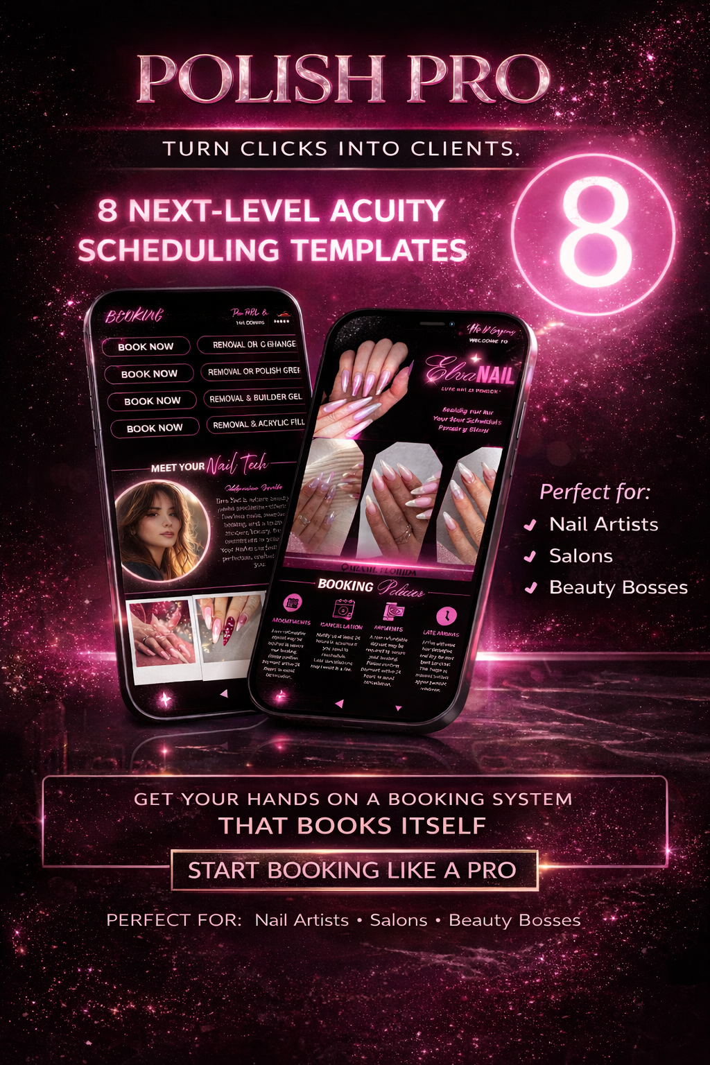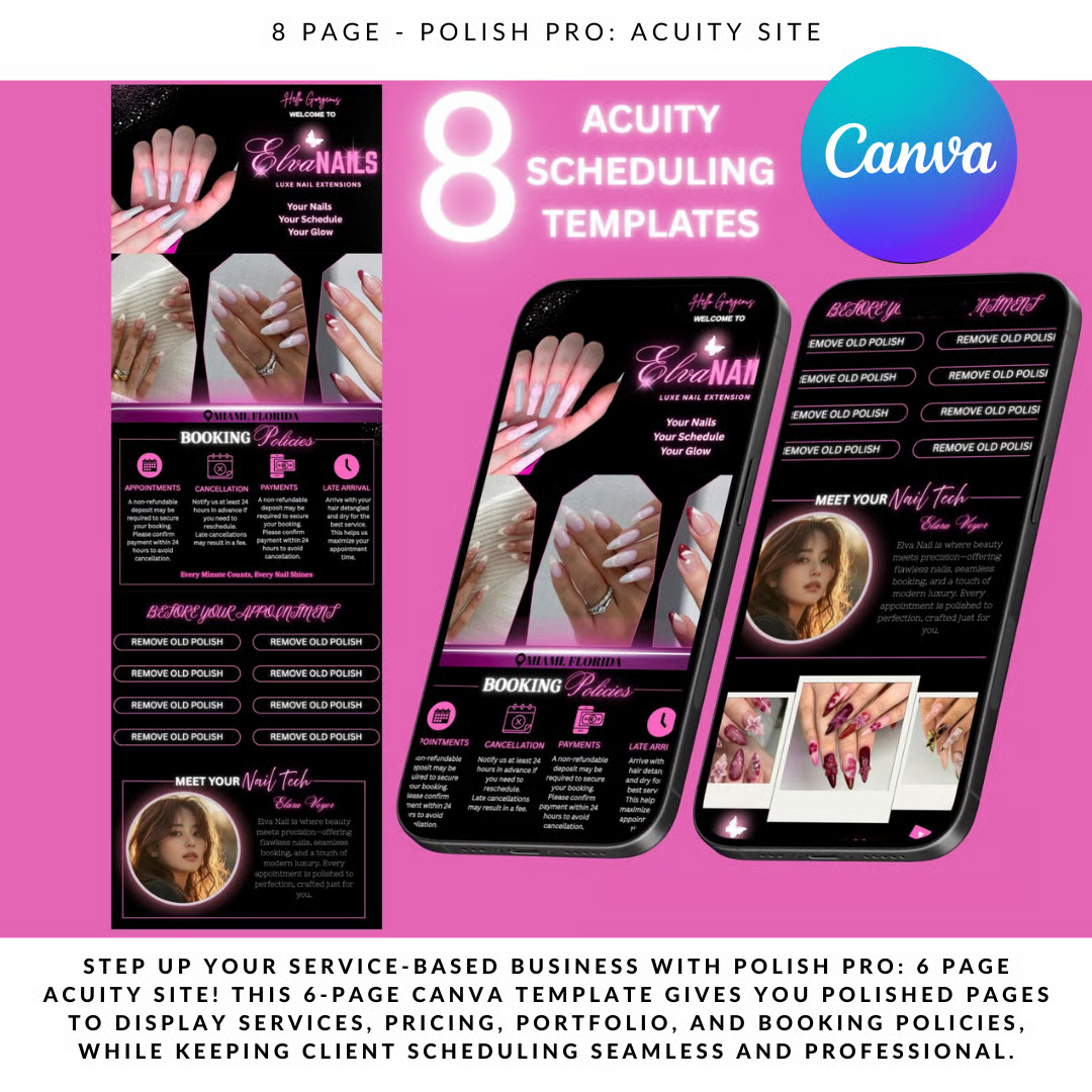 Step up your service-based business with POLISH PRO: 6 Page Acuity Site! This 6-page Canva template gives you polished pages to display services, pricing, portfolio, and booking policies, while keeping client scheduling seamless and professional.