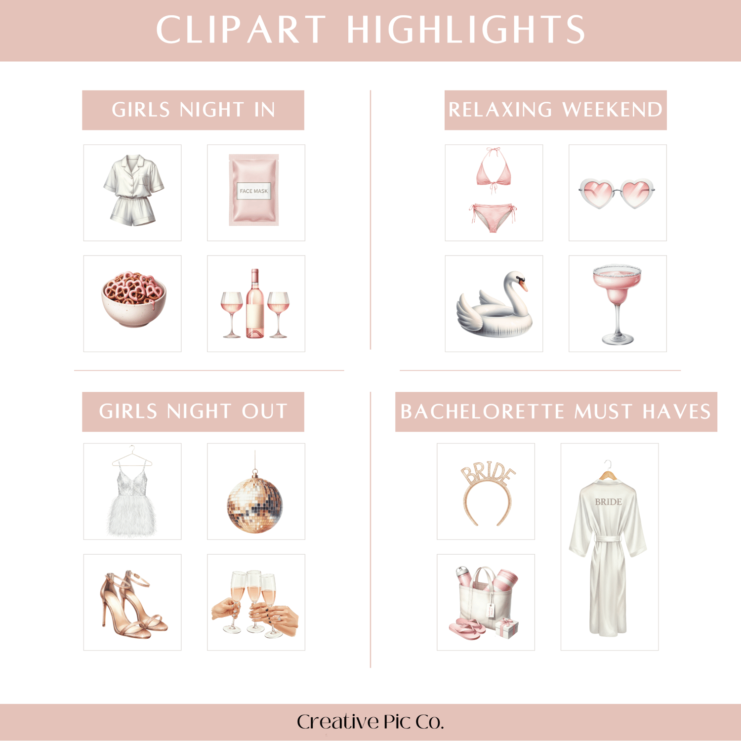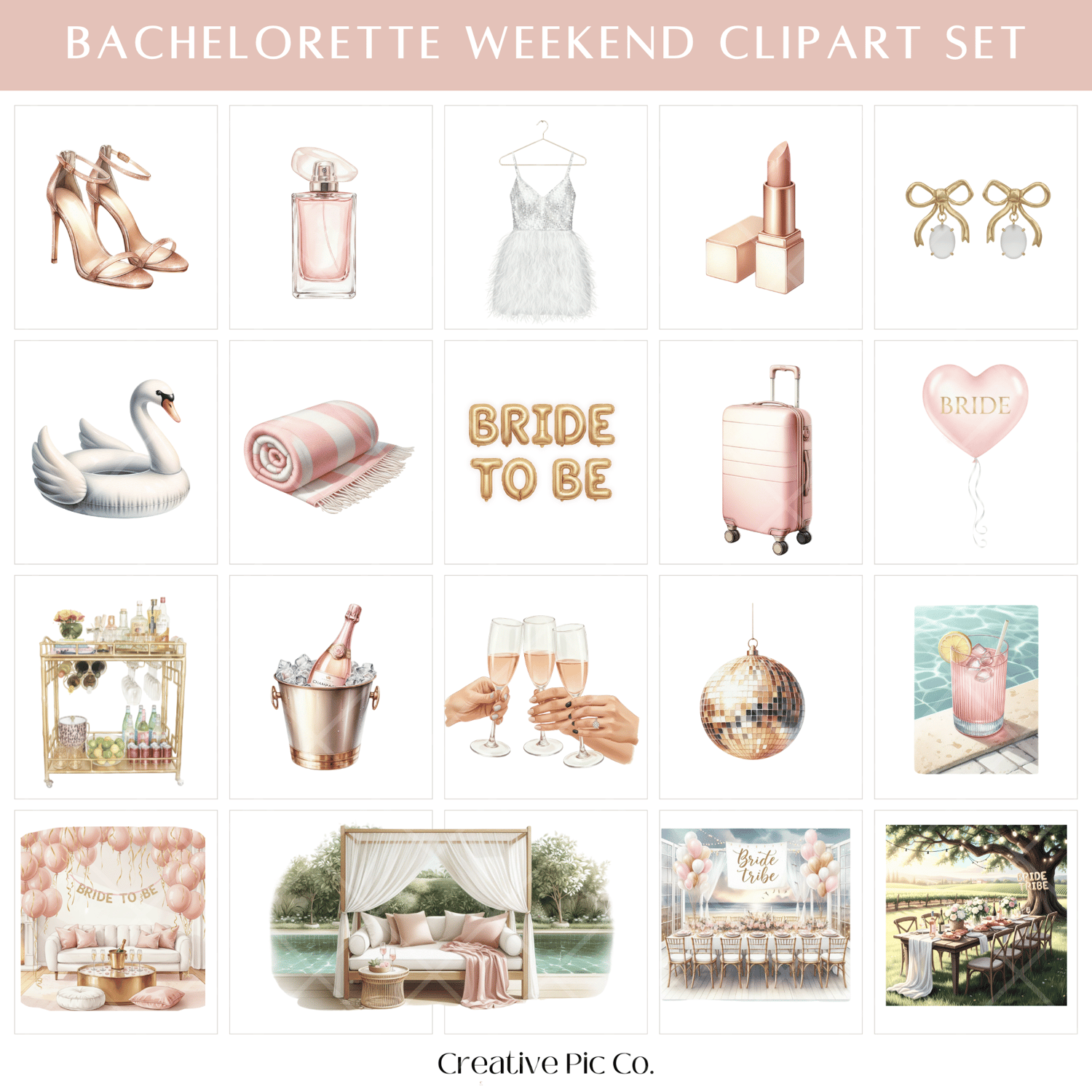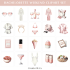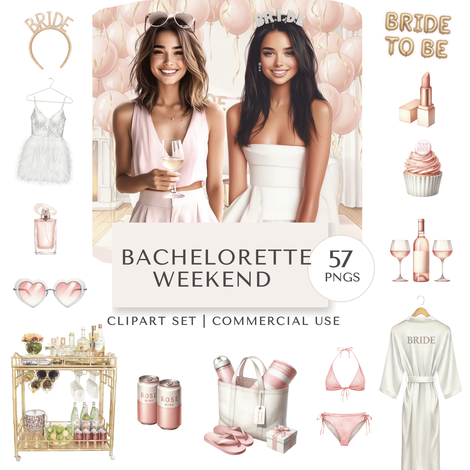 Celebrate in style with this Bachelorette Weekend Clipart Set! Featuring 57 chic PNG illustrations in soft blush, gold, and neutral tones, this set includes everything from champagne flutes and robes to balloons, makeup, and stylish bridesmaids. Perfect for party invitations, bridal shower decor, planners, and social media content, each piece has a transparent background for easy layering.