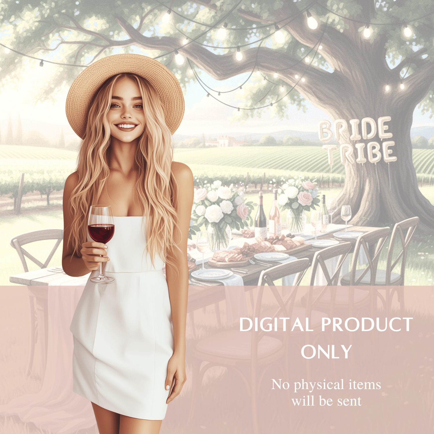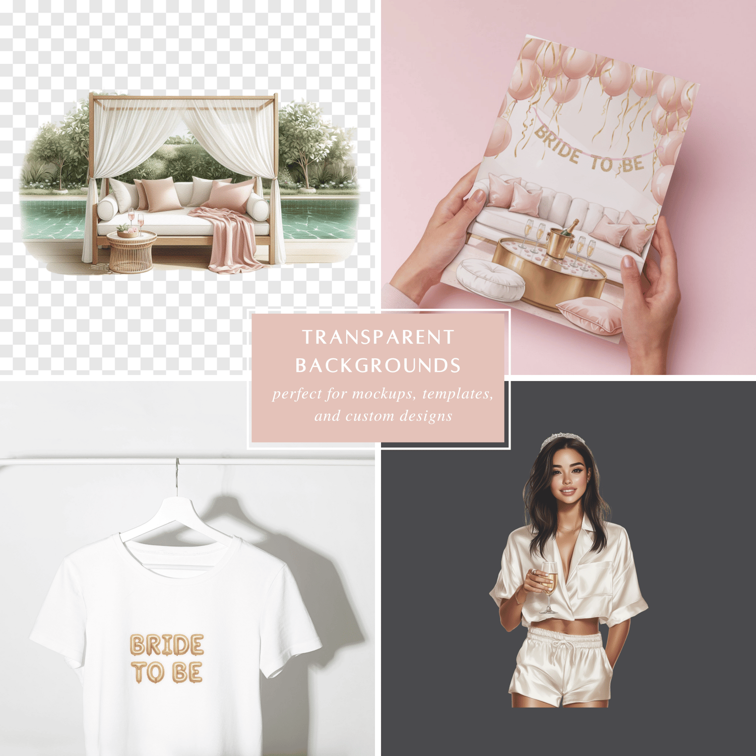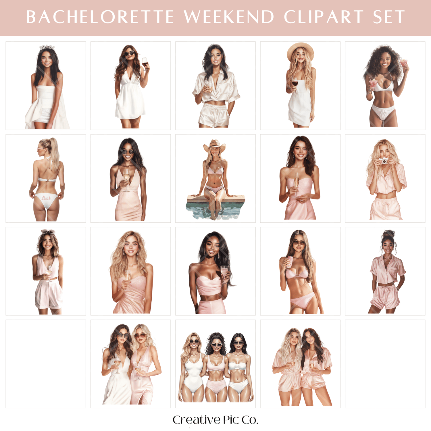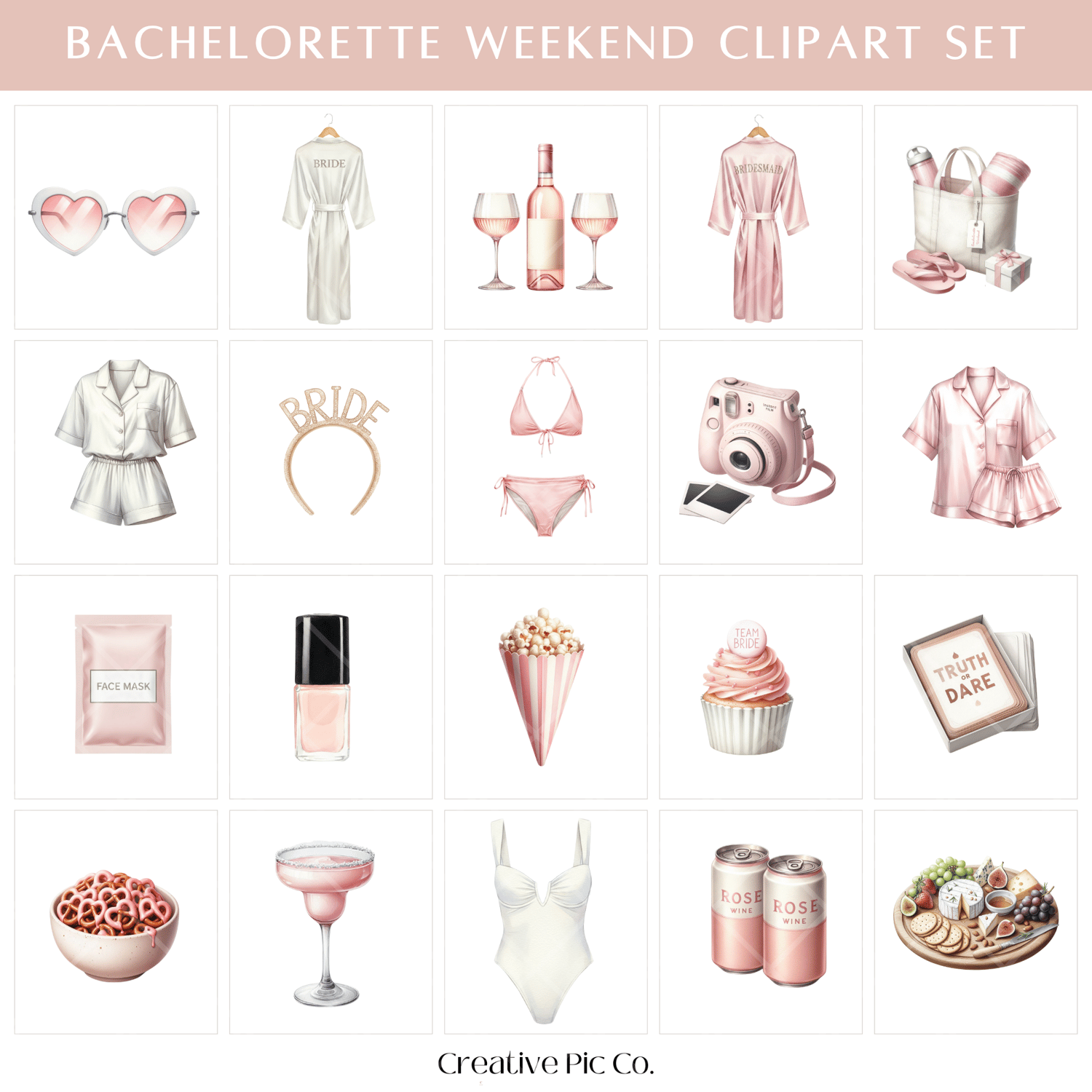 Celebrate in style with this Bachelorette Weekend Clipart Set! Featuring 57 chic PNG illustrations in soft blush, gold, and neutral tones, this set includes everything from champagne flutes and robes to balloons, makeup, and stylish bridesmaids. Perfect for party invitations, bridal shower decor, planners, and social media content, each piece has a transparent background for easy layering.