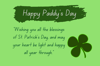 Text : The prominent phrase "Happy Paddy's Day" is rendered in a whimsical, handwritten font against a bold dark green background. Beneath this, a heartfelt message in cursive conveys: "Wishing you all the blessings of St. Patrick's Day, and may your heart be light and happy all year through," displayed in a warm deep green.