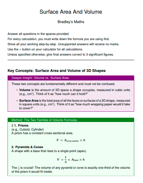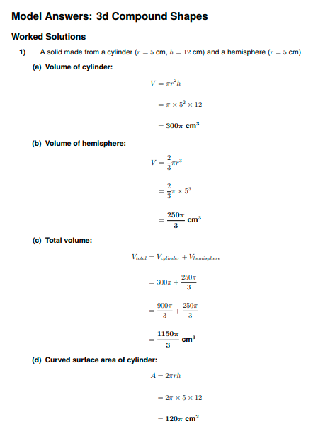 IGCSE Extended Level Maths: Surface Area and Volume (Worksheet & Model Answers)