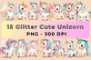 15 Glitter Cute Unicorn in watercolor PNG files in size: 5000 x 5000 pixels in 300 DPI with transparent background.