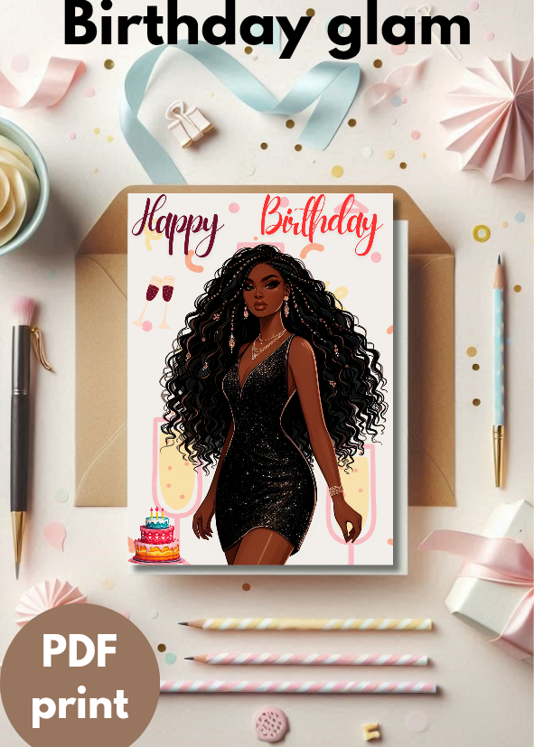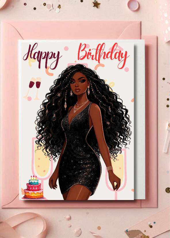 β¨This gorgeous "Happy Birthday" card features a stunning Black woman with gorgeous curls, dripping in that little black dress energy, and serving birthday queen vibes. Because every melanin queen needs a card that matches her energy!