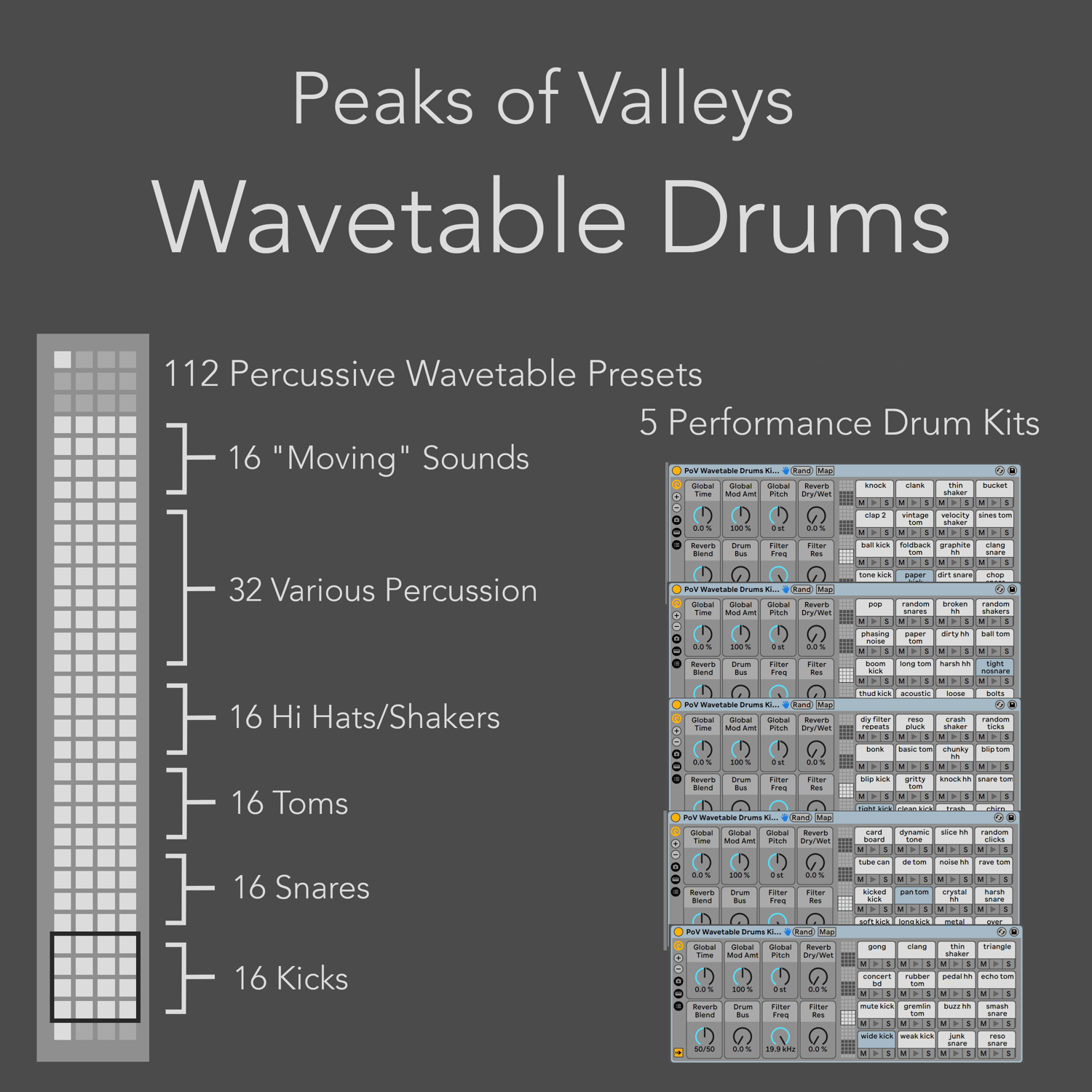 112 Total Wavetable Presets (16 Kicks, 16 Snares, 16 Toms, 16 HH/Shakers, 32 Misc, 16 Moving Sounds)