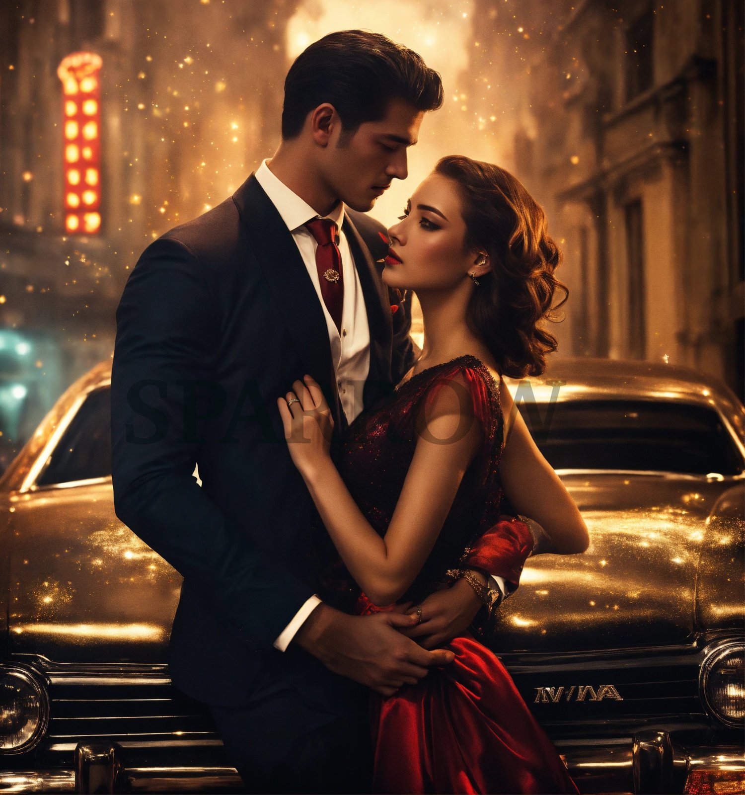 Shadowy cityscape, towering skyscrapers, dimly lit alleys, glow of neon signs, danger, passion, forbidden love, organized crime, sleek black cars, cigars, hidden weaponry, mystery, seductive couple, glamorous attire, intense gazes, secretive embraces, allure, swirling smoke, dark suits, ornate masks, vintage typewriters, flickering candlelight, complex relationships, tension, loyalty, desire, sultry, dangerous world, mafia romance, blood-red roses, silk ties, leather gloves, brass knuckles, shattered glass, playing cards, poker chips, gold chains, diamond-studded accessories, fedora hats, red lipstick stains, old-fashioned revolvers, secret meetings, handwritten notes, velvet ropes, dimly lit speakeasies, champagne flutes, engraved cufflinks, feathered quills, vintage photographs, wisps of gun smoke, double-crosses, silk scarves, brass light fixtures,star-crossed lovers, magical connections, love in the air. Romantic scene, Love concept, Storytelling, Digital art, AI, Creative design, Surreal atmosphere, Dreamy backdrop, Magical elements, Beautiful couple, Artistic composition, Commercial use, Atmospheric lighting, Mystical setting, Relationship concept, Emotive characters, Fictional love, Editorial use, Advertising, Marketing, Social media, Website design, Blog post, Article illustration, Book cover, Magazine layout, Poster design, Brochure, Presentation, E-book, Print material, Digital publication, Educational materials, Background image, Wallpaper, Conceptual art, Romantic moonlit scene, Enchanted forest setting, Moonlit meadow, Silhouetted trees, Nighttime romance, connection imagery, Romantic, Moonlit path, young adult romance, YA, serialized online fiction cover image, Radish, Dreame, GoodNovel, iReader, Vella, SWAG, book, author, writer, blogger, creator