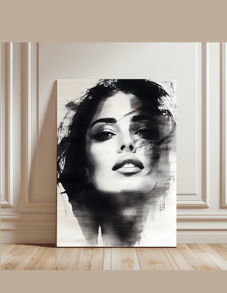Bring a touch of modern elegance and fierce beauty to your space with this captivating black and white wall art. This stunning abstract portrait captures a beautiful woman with expressive, dynamic brushstrokes, making it a perfect statement piece for any modern wall decor.