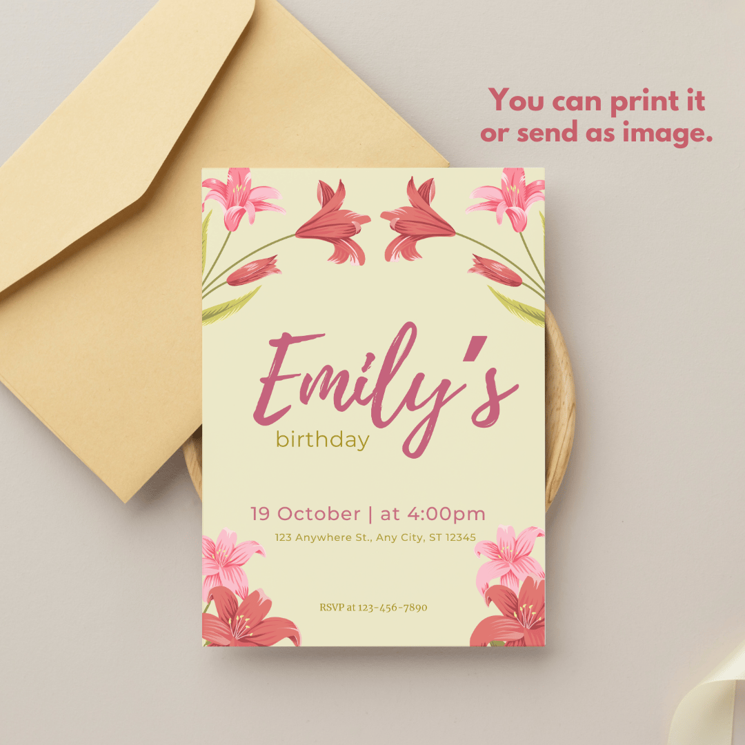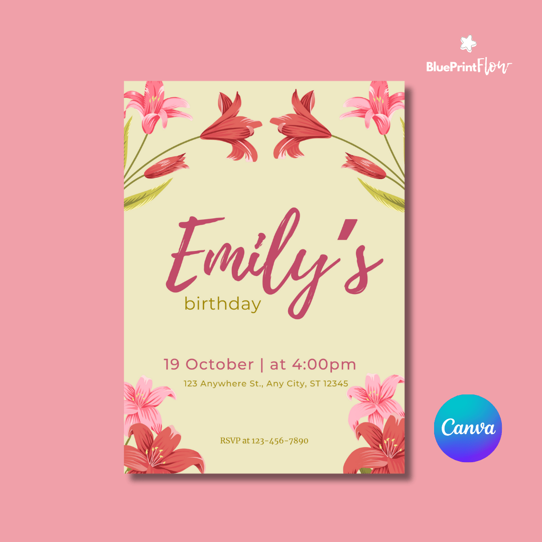 Cute Lily Flowers Spring Birthday Party Invitation Canva Template Design
