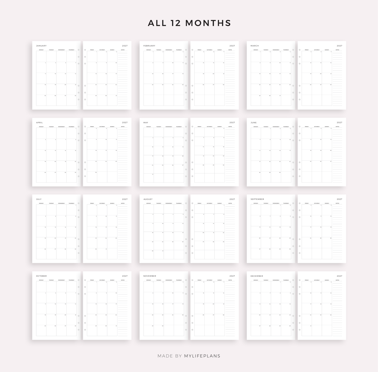 This is a printable 2027 monthly calendar on two pages with notes — just download, print, and start using it right away.