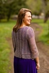The sweater is worked in one piece from a provisional cast on to the armholes where fronts and back are worked separately to the shoulders. A point d’esprit border is added to the lower edge later. Sleeves are worked in the same manner, then attached and seamed after sweater is blocked. A simple border is knit around the neckline to mimic the front edges. Sweater fits best with 1 to 2 inches positive ease. Instructions for adding top button not included.