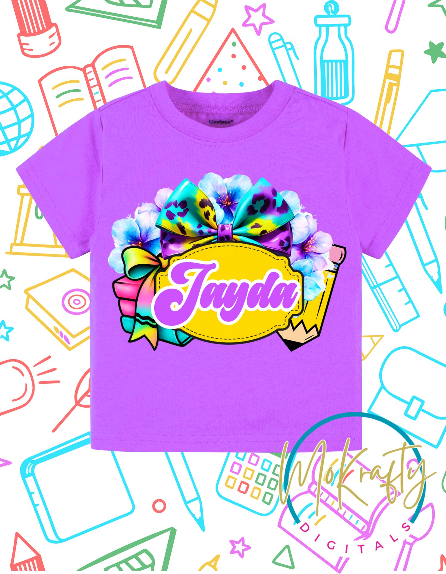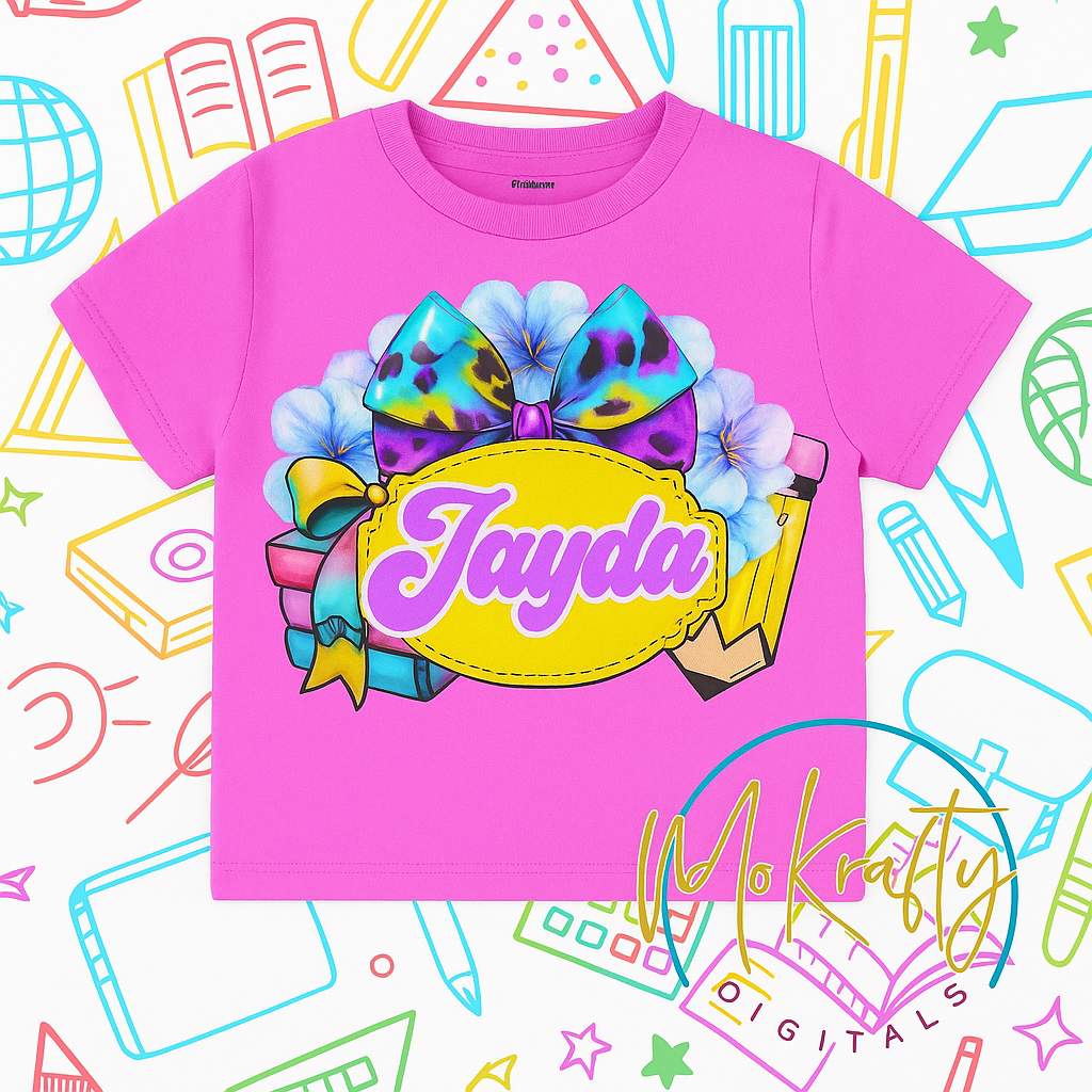 Make back-to-school season extra special with this colorful, customizable t-shirt design! Perfect for crafters and DIYers who sell personalized apparel, this editable Canva template lets you swap out the name in seconds. The design features a vibrant leopard-print hairbow, stacked books, pastel florals, and school supplies—ideal for creating standout shirts for girls heading back to class.