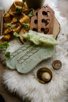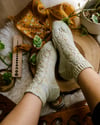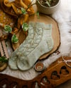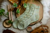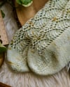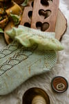 These socks were originally designed in 2021 and eventually they became the Effervescent Pullover. I hope you’ll enjoy the sock iteration, inspired by oolong leaves in the lace motif, with its adorable and engaging leafy lace panel and the frothy mohair ruffle.