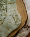 This pattern is knit top down, starting with the cuff with half-twisted rib. A lace panel is worked symmetrically for each sock down the entirety of the sock, with a classic eye of the partridge heel flap and gusset construction and a wedge toe.