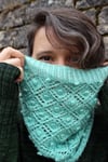 Aiguemarine is a stylish cowl pattern. Easy to grab and put on while going out the door, this cowl is fully covered with a diamond lace and bobble pattern, which makes every outfit shine !