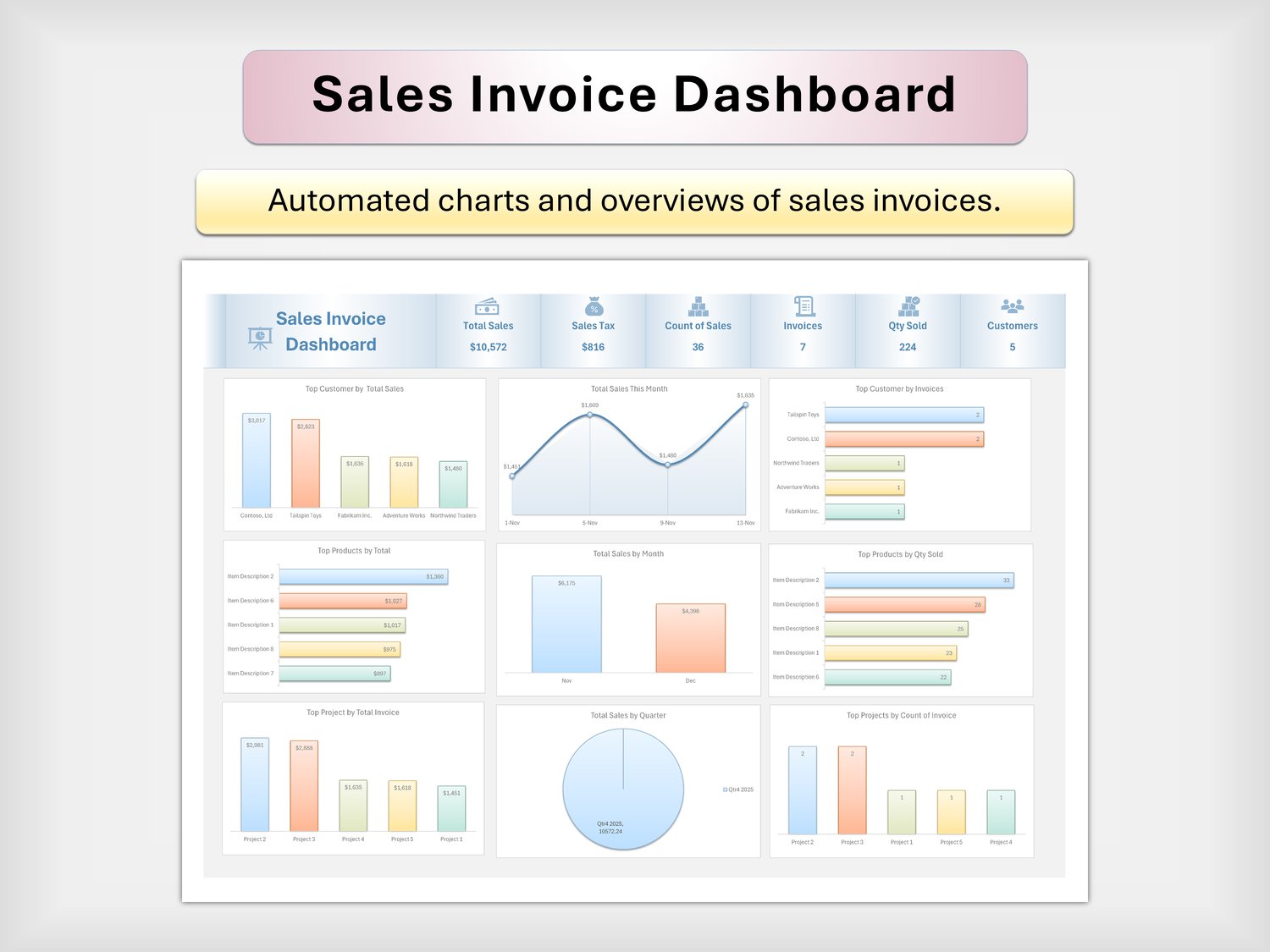 Visualize your sales instantly! Track top customers, best‑selling products, monthly/quarterly/annual sales, and tax totals — all updated with one click.