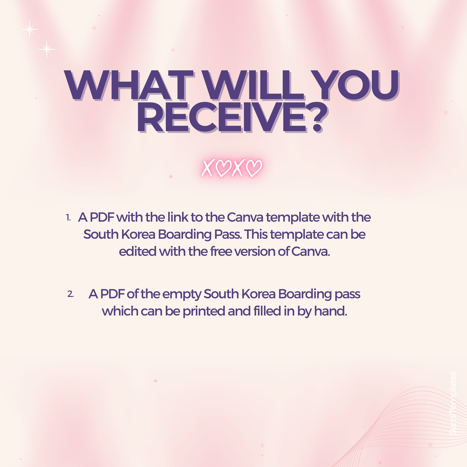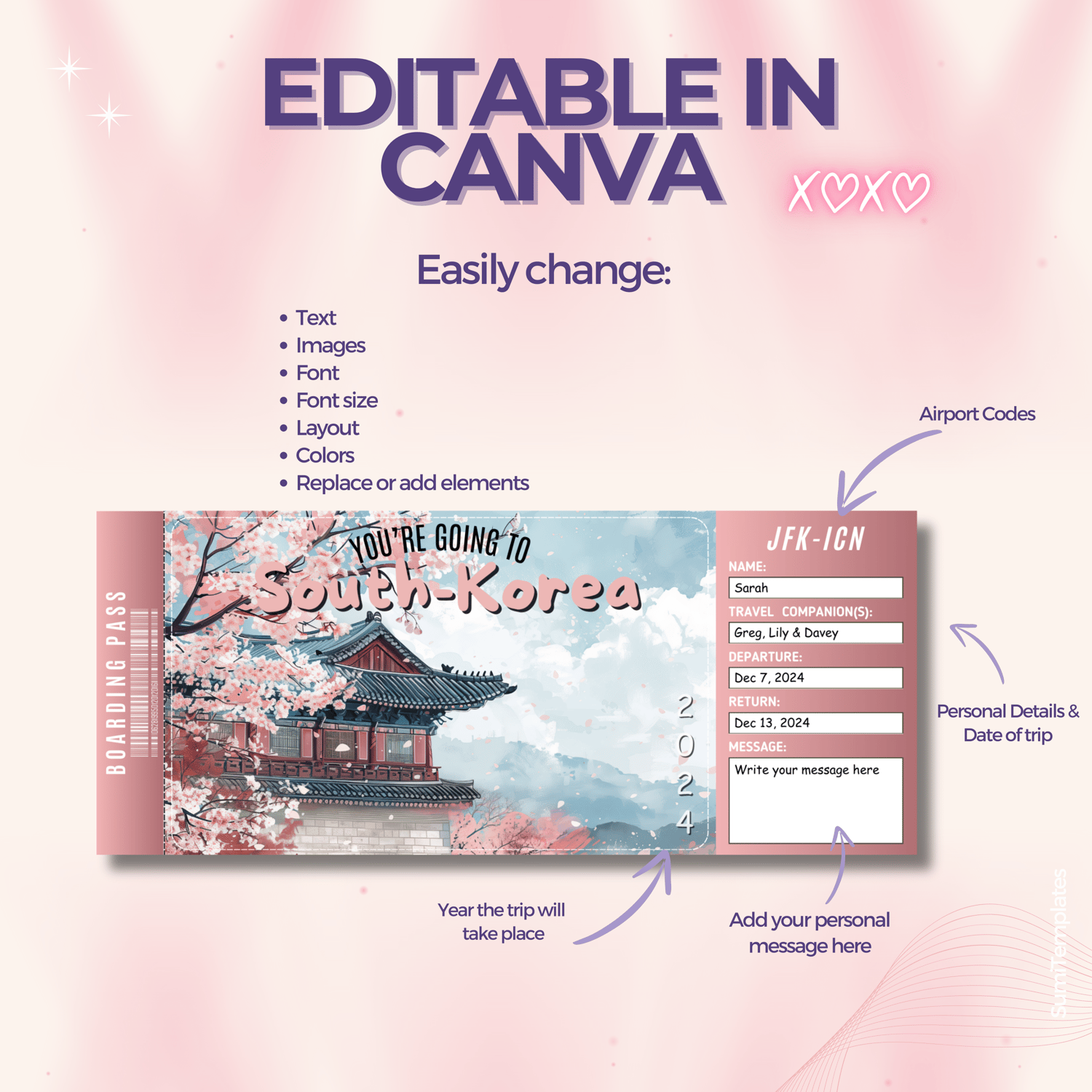 Craft your unique journey to South Korea with our Editable Boarding Pass Template on Canva, perfect for adding to your collection or gifting to a South-Korea (or K-Pop, K-Drama, K-Beauty) enthusiast. This template allows you to effortlessly create authentic-looking boarding passes, offering you the freedom to customize details such as flight dates, destination, and passenger names. Imagine presenting a customized boarding pass to Seoul as a surprise dream trip surprise – the ultimate unforgettable gift for anyone who loves Korean Culture, food, and shopping!